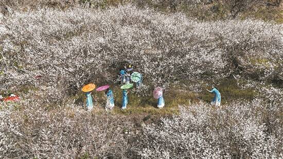 策划统筹/魏琴 文/羊城晚报记者 郑俊良 在严寒中,梅开百花之先,独天下而春。腊八年味始,寒梅来添香。羊城晚报《大美岭南》第106站走进云浮新兴里洞镇上盆山村,放眼望去,那漫山遍野的梅花如云似海,阵阵幽香扑鼻而来。目前,上盆山村的梅花正值最佳观赏期。 岭南无雪,傲雪的寒梅被称为“香雪”。云浮新兴的天露山下,长着大片青梅。每年冬春时节,山山飘“雪”,幽香浮动。 里洞镇素有“江的源头、云的故乡、花的世界、林的海洋、肺的氧吧”的美誉,而冬季的梅花盛景,便是它最为耀眼的时刻。 位于里洞镇上盆山村的山谷,因气候适宜,当地农民种植了数百亩青梅,收成的青梅可做成新兴当地名产——话梅、梅子酒等。这满山的经济作物,因这地形的起伏错落,竟形成了层次丰富的连片花海。 上盆山的青梅有成片种植的,也有沿着溪流和山坡种植的,更有在农舍前后栽种的。数百亩青梅分布于丘陵山谷和梯田中,迎寒而放,层层叠叠,美不胜收。花开时节,漫山遍野、林舍掩映,起伏有致。溪流和村庄所在,都变成漫山花海。晨光里、夕阳下、山雾中,阳光与雾气相辉映,举目之下,飞雪连天,清香入怀,如入仙境。妙的是溪流与村庄的相遇,更让这片花地有了别样的意趣。而因为这花海盛放,小蜜蜂也纷纷飞来凑个热闹,嘤嘤采蜜。 上盆山村的梅花名声在外。每到花季,往往吸引了邻近的县市甚至珠三角的游客慕名而来,花海中游人如织,村道上车水马龙。而到上盆山的公路九曲十八弯,驾车须格外小心,狭窄处应该相互避让。 新兴话梅产量高,青梅种植面积广阔,每年花季,有名的赏梅胜地还有太平镇西水旧村、天堂镇黄京田村、大江镇汶滩村和太平镇曹田村等。