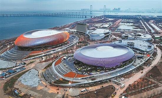 新春期间,位于粤港澳大湾区“地理几何中心”的广州南沙全民文化体育综合体综合体育馆(左)、游泳跳水馆点亮屋面照明系统,多彩华灯点亮节日夜空。 正在建设中的广州南沙全民文化体育综合体综合体育馆、游泳跳水馆屋面照明分别由近9000套线型投光灯与5000多套点光源组成,体育馆外立面共有9630米链式投光灯,游泳跳水馆外立面可折弯灯带长达15442米。 (文/图 新华社)