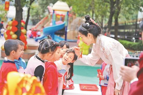 广州南沙区第一幼儿园举行的开学活动上,老师为学生行“朱砂启智”之礼 通讯员供图 |