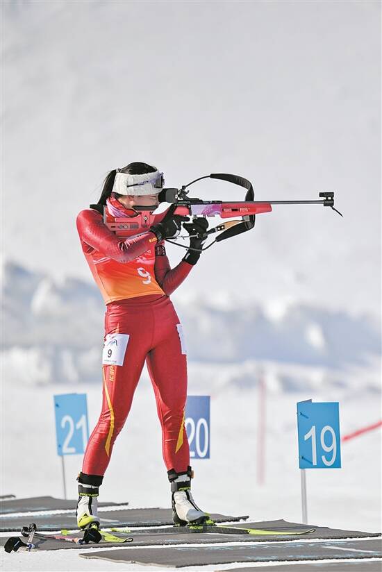 2月11日,冬季两项女子7.5公里短距离比赛在亚布力举行,中国选手杨连红在比赛中射击 |
