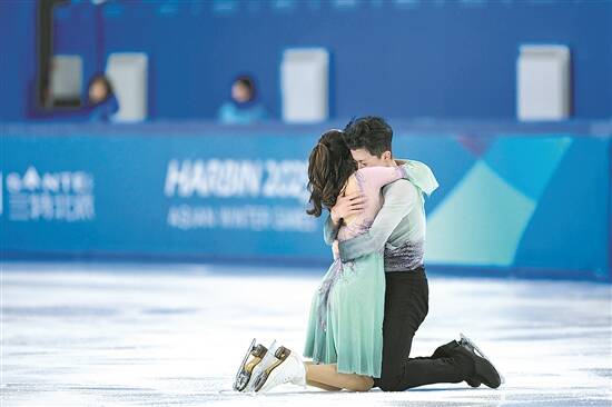 2月12日,广东冰舞组合肖紫兮(左)与何凌昊在花样滑冰项目冰舞自由舞比赛后激动相拥 |