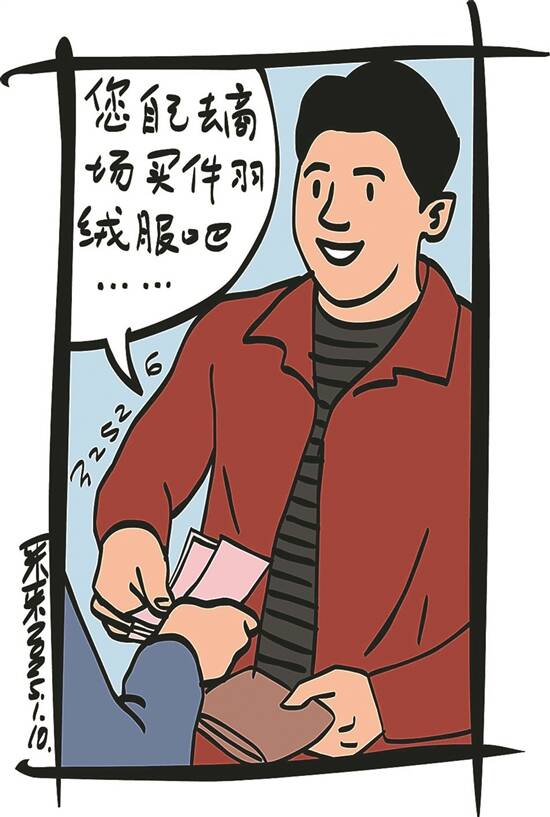 插图:采采 进入立冬,志远递给父亲一千元钱,交代父亲自己去商场买件羽绒服。父亲节约了一辈子,哪里舍得买好衣服,最后花50元买了件地摊货。 晚上下班回来,志远摸了摸衣服面料,对父亲说:“爸,现在咱有钱了。”父亲把脸一横:“钱要省着花,日子要节约着过。你不就拿点死工资吗,能多有钱?”志远听了哭笑不得。 第二天是周末,大清早,志远从房间里突然冲到厨房,对正在下面条的父亲喊:“爸,我中奖啦,彩票中奖啦!”父亲看着志远手中的彩票,问中了多少钱。 “二等奖,三千元。反正是中的奖,今天我休息,我带您再买件好一点的羽绒服吧?”父亲嘀咕着:“我昨天买的不挺好嘛。”志远劝道:“50元钱的羽绒服,里面会是羽绒吗?专家说今年是个寒冬,您必须买件好的。” 父亲不再说话。志远心想,这老头可算是低头了。怎料,父亲突然又说:“你待会带着我一起去彩票店,我要看到你是真中奖了,我才答应你。”志远一愣,马上笑着答道:“没问题!” 志远和父亲刚走到那家常去的彩票店门口,老板就大声说:“恭喜啊小李,又中了三千元。”说完就从抽屉里取出一沓钞票递过来,父亲看了笑得合不拢嘴。 (董川北)