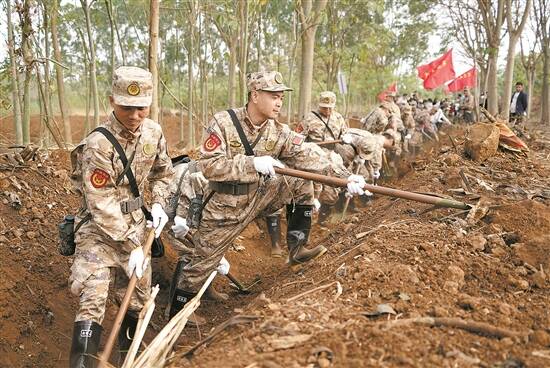 羊城晚报讯 记者胡彦,通讯员黎浩然、莫馥瑜、粤水轩摄影报道:“看到民兵兄弟们在山石、泥浆中干得这么拼,咱们老百姓也得加把劲!”2月19日,在民兵参加环北部湾广东水资源配置工程二期建设启动仪式后开展的清淤行动中,村民张大姐放下农活,主动加入清淤队伍。当天,民兵与群众结成“1+N”互助小组,累计清理淤泥超8700立方米。清淤工作初见成效,为顺利开展环北部湾广东水资源配置工程二期建设打下坚实基础。 2月19日,民兵参加环北部湾广东水资源配置工程二期建设启动仪式在广东省湛江市举行。省军区、省水利厅主要领导,湛江市委、市政府领导同志,湛江、肇庆军分区主要领导及参建民兵分队和干部群众在主会场参加活动,雷州、廉江、徐闻、遂溪设分会场同步举行启动仪式。 启动仪式后,数台挖掘机加足马力开始作业。身着迷彩服的民兵队伍则率先来到这些“钢铁清道夫”无法进入的任务点。他们跳入齐腰深的涵洞,徒手清理堵塞的树根碎石。在民兵带动下,周边群众纷纷自愿加入清淤队伍,加上志愿者团队的助力,大家齐心协力疏通“民生渠”,构筑“安全堤”。 在作业过程中,淤泥深积、地形复杂是首先要面临的难题。在遂溪县作业区域,400余名民兵调配30余台挖掘机和自卸车分片攻坚,以“人歇机械不停”的连贯作业模式持续攻坚。“面对繁重的工程建设任务,我们将提效率、赶工期、攻难关,坚决做到不辱使命、不负重托。”参与清淤行动的基干民兵代表郑志辉说。遂溪青年志愿者代表苏广宇对记者说,他从“i志愿”系统里报名参加本次清淤行动,当天主会场有超过40名志愿者和他一同铲污泥、清杂物。 截至2月18日,湛江市已完成清淤量71.6万立方米,占去冬今春计划任务的43%。据统计,此次清淤行动当天累计清理淤泥超8700立方米。 活动现场,省军区相关负责人指出,要充分传承雷州青年运河“为民、担当、奋斗、廉洁”的精神,发挥民兵先锋骨干作用,积极引领发动群众,共建绿美雷州半岛水美乡村。湛江市委书记余钢表示,民兵队伍是党领导下的一支重要力量,必将展现出新时代民兵队伍参与水利工程建设的新风采。省水利厅党组书记黄志坚现场表示:“我们水利系统将全力做好民兵参建的各项支撑保障工作,组织水利技术人员、能工巧匠,与民兵一道,并肩作战,打赢水利清淤攻坚战。”