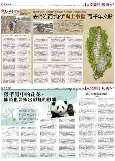□周洲 在成都大熊猫繁育研究基地的翠竹掩映中,一只名叫“花花”的熊猫幼崽越来越被游客和亿万网民熟悉。与其他熊猫幼崽不同,它右后脚掌天生外翻,四肢力量不均衡,走起路来前腿内八、后腿外八,仿佛踩着天然的芭蕾舞步。这种独特的步态总让游客们忍俊不禁。这只熊猫因此成了基地里最特殊的熊猫幼崽之一,也成了我的儿子果果最喜欢的熊猫之一。 一 果果第一次见到花花时,他趴在观景台的玻璃幕墙上,呼吸在玻璃上晕开白雾,手指追着那个摇摇晃晃的身影大喊:“爸爸、妈妈,花花在跳《天鹅湖》。”这童稚有趣的比喻让周围游客会心一笑,却意外点破了生物学家们的研究发现——花花虽然有天生的生理缺陷,但它失衡的步态中却蕴含着独特的运动美学。 果果对花花产生了浓厚的兴趣,在持续不断地前往基地探究花花的生活习性过程中,他还制作出一本“花花成长手账”,记录了许多关于花花的成长细节。 在这本手账中,果果用贴纸标注出一些令他困惑的变化:春季的花花像蓬松的糯米团子,秋季却变得修长轻盈。饲养员根据果果的这一发现向他解释了熊猫毛发随季节变化的奥秘。而他们的这段对话被录制下来,并制作成基地推出的科普动画里的经典场景。后来,当果果在基地自然教育中心听到有游客在看到这段动画并复述他发现的这一细节时,他的眼睛亮得像发现了恐龙化石:“原来我的小问题真的是大问题!” 科研人员一直在帮助花花进行特殊的野化训练,在海拔3000米的模拟野化训练场,花花的日常训练堪称科学与温情的完美融合。饲养员谭爷爷独创了“美食诱导法”将体能训练融入花花的生活细节:他用竹签串起苹果片悬挂于木架高处,引导花花后肢发力站立;他将窝窝头碎屑撒在斜坡上,促使花花自主学习攀爬技巧。动物行为学家通过三维运动捕捉系统分析了花花在这个过程中的行为,他们发现,花花通过调整重心偏移角度,创造出独特的“摇摆式攀爬法”,其能量消耗的效率竟比常规方式提升了15%。 某个秋日下午,前往现场观察的果果发现训练场的银杏树下散落着特殊的“地图”——那是花花练习攀爬时蹭落的竹叶,每片叶背都粘着浅浅的爪印。他用放大镜观察后发现,右侧爪印总比左侧深0.5毫米。“因为花花右脚要更用力呀!”果果的这个发现促使饲养员调整了攀爬训练架的摩擦力分布。果果后来因此收到了科研组回赠的3D打印爪印模型,这更激发了他观察花花的热情,有一次,他认真地对花花说:“你现在是我的动物同学啦。” 二 在一个亲子开放日,果果又获得了给花花递竹笋的机会。他注意到花花的进食方式与其他熊猫不同:它会用前掌把竹笋滚到斜坡上固定,再像吃玉米那样竖着啃食。他立刻指出:“这是花花发明的防掉落餐盘。”但他模仿花花这个动作时却打翻了果盘,这件事却意外地启发了自然教育中心的饲养员设计出一种熊猫的防滑食槽。 果果的手账中还记录了花花的许多光辉时刻:它性格温吞,却成为它突破生理局限的独特武器——在2022年的冬季体能训练中,它以每分钟仅移动3米的“龟速”完成任务,成为首只完成连续10米平衡木行走的特殊个体;2023年春季的攀树训练时,当其他幼崽已爬上树顶开始悠闲啃竹子时,花花仍在两米高的树杈间徘徊。但红外监测影像仪很快记录下震撼一幕:只见花花突然改变策略,用前爪钩住树干纹理,后肢呈螺旋状交替发力,以近乎垂直的角度完成了自己的首次自主攀爬。后来这种攀爬方式被命名为“花花螺旋”式,成为了研究人员手中残疾熊猫野化训练的标准教材。在基地的基因库里,花花贡献的毛发样本具有特殊价值。她的DNA序列中检测到罕见的“秦岭-岷山”双重基因标记,为破解大熊猫小种群遗传瓶颈提供了关键线索。2024年,基于这些研究成果建立的DNA数据库,成功指导了龙门山区域的首次跨片区个体交流计划;2025年春节,花花在“熊猫文化国际周”的直播镜头前,慢悠悠地爬上特制领奖台,它用鼻子轻触“生态友好大使”奖牌的画面,迅速通过卫星信号传遍全球126个国家。这个曾被预言难以成年的特殊个体,如今已成为生物多样性保护的鲜活符号——它的成长纪录片在美国纽约自然历史博物馆循环播放,它的卡通形象出现在联合国气候变化大会的宣传片中,它的粪便被制成生态纸张,它的日常影像成为AI训练素材,它的生命故事更化作千万孩子心中的绿色火种…… 花花的成长轨迹确实打破了人们对“完美”的固有认知——右后掌的天生外翻,成为它创新攀爬方式的契机;温吞的性格,成为它能持之以恒完成任务的优势,甚至它在抢食时的“弱势”也反而培养了它独立觅食的能力……它的故事一直在告诉所有人:在生态保护的宏大叙事中,每个生命的“不完美”都是进化赋予的特殊礼物。 而我的儿子果果也在对花花的观察过程中收获满满。他在一场自然课的演讲时勇敢地发声:“花花教会我,就算摔跤也要摔出彩虹的形状。”当我看到在这个被数据与算法充斥的时代,孩子澄澈的目光与大熊猫湿润的黑眼圈温柔相对时,忽然读懂:所谓“国宝”,不仅是需要被保护的脆弱生命,更是照亮人类文明进程的明灯;所谓文明,不过是让每个生命都能找到自己的观星台。