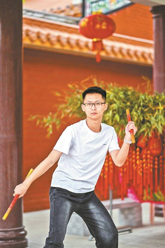 陈汉森在广州做电商运营,饰演“小李广花荣”,今年24岁,对英歌充满热爱,小时候在家就已经拿水管学着英歌比动作了 |