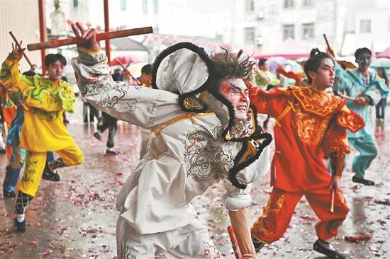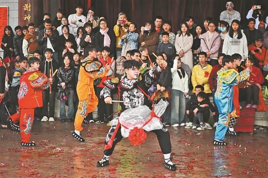 文/图 羊城晚报记者 林桂炎 邓鼎园 元宵节的清晨,天刚蒙蒙亮,空气中还弥漫着细雨带来的凉意。汕头潮阳大棉田长园古庙外却早已人声鼎沸。辛宰槟作为长园英歌队的教练,正带领队员们做着最后的准备。他们为了这一天的表演,已经提前一两个月开始训练,只希望能将最完美的状态呈现给观众。 潮汕的年,过得比其他地方要长。尤其是农历正月,当英歌舞的鼓点响起,整个地区瞬时点燃了文化激情。 近几年来,它也逐渐成为一种“国潮”。春节期间,无数外地游客涌入潮汕,只为目睹这项民俗活动的盛况。 英歌舞的起源可追溯至古代中原地区的“傩舞”,是一种驱邪祈福的祭祀仪式。随着中原移民南迁至潮汕地区,傩文化与当地民俗相结合,逐渐演变成了今天我们所见的英歌舞。舞蹈题材多取材于《水浒传》中的故事,如“梁山好汉大闹大名府”营救卢俊义的情节。表演者们身着华丽的服饰,手执木槌,随着锣鼓声变换阵法,威武壮观。 如今,潮汕英歌队数量很多,仅潮阳区就超过100支。长园英歌队是大棉田4支队伍之一,已有40多年的历史,属于中快版英歌。队员都是村里的年轻人,有学生、个体户、上班族等等,只是纯粹为了村里的盛会而舞。这一群平凡的普通人,平时都比较矜持,只有脸上画上了油彩脸谱、听到木槌撞击声、看到祠堂的灯火、穿上华丽的服饰,他们的舞姿才会变得奔放和狂野。 15岁的辛升润饰演“小秦明”,是棉北中学初一学生,队里年纪最小的队员,个头不高,机灵活泼,舞得非常好,已经被认定为队里以后的“头槌”了。“我从小就觉得英歌舞非常酷炫,服饰也十分帅气,所以7岁就开始自学,现在非常热爱英歌,想一直舞下去。”他说。 陈汉森在广州做电商运营,这次饰演“小李广花荣”,他说:“小时候在家就已经拿水管学着英歌比动作了。英歌舞的气势和正装出游的氛围都非常吸引我。而且既可以锻炼身体,又可以传承民俗文化。” 过年放假一回家他就到队里参加训练,他觉得跳英歌是有瘾的,虽然训练真的很累,练完手脚都是酸的,但这一切都值得。 他们的想法很单纯,觉得跳英歌很酷,能为村里出力更自豪。“霹雳火秦明”辛宰榜、“宋江”陈培鑫也都是队里的中坚力量。他们从小就看老辈人跳英歌,一步一步与英歌结下深厚缘分,也在无形中为传承民俗文化贡献力量。 8点许,伴随着鞭炮声和锣鼓声,潮阳大棉田长园古庙游神盛会正式上演。首先英歌开路,队员们化身为梁山好汉依次登场,随着鼓点的节奏变化,或高跃起舞,或用力敲槌,或齐声呐喊。他们踩在满地的红色鞭炮碎纸上,刚劲、雄浑、粗犷、奔放;步法、身法、槌法和阵法,令人叹为观止。 “很多招式是我学习视频后再融入自己的想法所创造出来的,然后大家一起研究练习”,辛宰槟说。随着时代的变迁,英歌舞也在不断地发展和创新,长园英歌队也在改变,希望在保留传统的基础上融入新的元素和创意,使得这一古老的艺术形式焕发出新的生机。