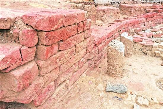 南海卫城墙基址红砂岩包墙石 羊城晚报记者 王俊伟 摄 |