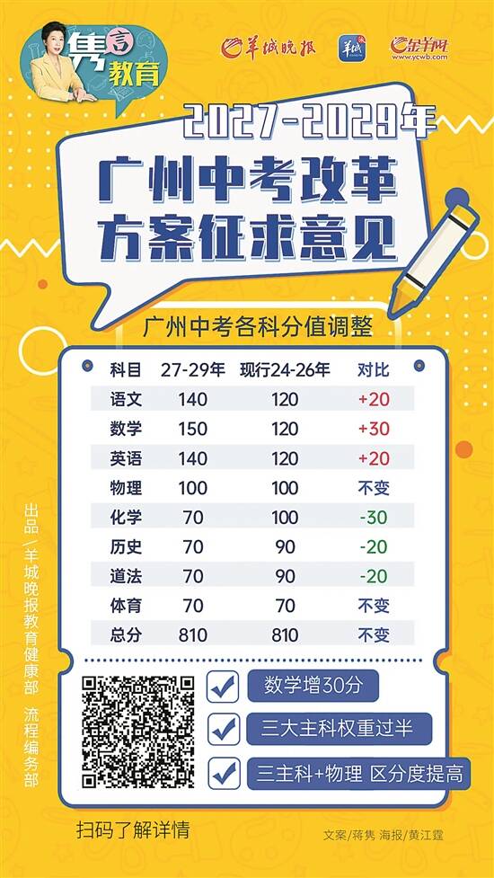 羊城晚报记者 蒋隽 2月28日,广州市教育局发布《2027—2029年深化高中阶段学校考试招生制度改革的实施意见(征求意见稿)》(以下简称《中考改革实施意见》)和《2027—2029年广州市初中学业水平考试体育与健康科目考试实施意见(征求意见稿)》(以下简称《体育中考实施意见》),就以上两份文件征求公众意见。 其中,最受家长关注的是,中考计分科目分值分配拟大调:数学增加30分,满分达150分,成为分值最高的学科;语数英三大主科占总分的比例从44.4%上升到53.1%;物理在副科中分值最高,比化学、历史均高出30分。 此外,随迁子女招生计划比例上限拟提高2个百分点;中考体育部分项目的考试标准和评分规则拟优化;第一批次拟设置特色普通高中招生计划,将原有外语、艺术类招生计划纳入其中,该批次同时增加中本贯通培养试点招生计划。 政策调整 变化1 主科总分权重过半,物理在副科中最重要 与现行方案相比,《中考改革实施意见》最明显的调整在于计分科目分值分配。8个科目中,6个科目满分分值有显著变化:语文增加20分至140分,数学增加30分至150分,英语增加20分至140分,历史减少20分至70分,化学减少30分至70分,道德与法治减少20分至70分;物理100分不变,体育与健康70分不变。总计满分为810分,与当前保持一致。 调整后,数学、物理分值比重加大。数学成为分值最高的学科,突破了以往语数英同分的惯例。物理在副科中分值最高,比化学、历史高出30分。 这也意味着,各学科权重有变。三大主科总分从360分上升到430分,在8个科目总分中的占比从44.4%上升到53.1%,数学、语文、英语单科占比从14.8%分别提升至18.5%、17.3%、17.3%。语数英+物理的占比从此前的56.8%上升到65.4%,提升近10个百分点。数学+物理总分从220分上升到250分,占总分比例从27.2%上升到30.9%。 文科和理科的总分虽然不变(文科420分、理科320分、体育70分),但侧重的学科发生了变化,强化数学、物理、语文、英语。 变化2 随迁子女招生计划比例上限拟提高两个百分点 《中考改革实施意见》拟微调公办普通高中招收随迁子女的计划比例上限,从现行的“8%-18%”调整为“8%-20%”,具体比例由各区、各省市属公办普通高中根据实际情况自行确定,其他政策不变。 广州市教育局表示,考虑到2024年起公办普通高中招收随迁子女计划已与户籍生计划同时投档录取,录取随迁子女分数“倒挂”“断档”已基本消除。提高计划比例上限,可以让部分随迁子女占比较大的区在“8%-20%”范围内适当调增招收随迁子女最大计划的比例,有利于保持随迁子女公办普通高中录取率及录取人数的稳定。 变化3 第一批次招录拟扩容,增加中本贯通招生计划 广州拟在招生录取第一批次设置特色普通高中招生计划,将原有外语、艺术类招生计划纳入其中,深化普通高中育人方式改革,推动普通高中多样化特色发展;在第一批次增加中本贯通培养试点招生计划,开展中职学校与本科高校“3+4”七年一体化培养试点,畅通技术技能人才成长通道。 变化4 优化部分体育统考项目考试标准和评分规则 《体育中考实施意见》则显示,将结合往年体育统一考试各项目考生得分情况,重点优化部分项目的考试标准和评分规则,均衡各项目难易程度,使评分标准更科学,更有利于引导考生根据兴趣爱好选择相应项目考试。 热点问答 为何增加语数英分值?为何数学分值最高? 提高语数英三大主科分值,特别是将数学分值提至最高,具体的考虑是什么? 广州市教育局表示,提高语数英分值占比、强化语数英基础学科是中考改革大势所趋。在中考总分保持不变、文理科占比保持不变的前提下,进一步优化录取计分科目分值设置,适当提高语数英三科尤其是数学科目分值,适当减少道德与法治、历史以及化学科目分值,向前有效衔接义务教育新课程改革,强化语数英基础学科,同时适当减少识记类知识的考查,适当减轻学生的学习负担,持续巩固“双减”成果;往后有效衔接新高考综合改革,更有利于普通高中人才培养,更适应国家人才培养战略需求,同时也充分展现广州市作为省级数学教育高质量发展示范区所具备的数理培养特色与引领作用。 广州市教育局还指出,英语与语文科目分值同步提高,一是助力广州市建设中心型世界城市;二是引导考生增强跨文化沟通理解能力,培养具有国际视野、全球意识与家国情怀的国际化人才;三是与新高考分值结构相衔接。 针对录取计分科目总分保持810分不变,广州市教育局表示,主要是为了方便考生参考往年录取情况填报志愿,方便教育管理、质量监测、招生录取等工作。 为何降低历史、化学、道法分值? 广州市教育局表示,历史、化学、道德与法治的分值调整,一方面更符合义务教育课程方案、课程标准、课程容量要求,有利于教师开展更多实践性、探究性教学,关注培养学科思维;另一方面通过教学方式和学习方式的转变,可以适当减轻学生的学习负担,有助于激发学生对这些科目的探索兴趣。 此外,道德与法治科目的考试方式保持不变,拟继续实施全闭卷笔试。广州市中考道德与法治科目在2002-2020年实施开卷、闭卷相结合的考试方式,自2021年起经综合研判改为全闭卷考试。广州市教育局表示,实践表明考试方式并非培养学科核心素养和影响学习负担的决定因素,下一步将继续通过实施核心素养导向的教学和命题改革,进一步提升教学