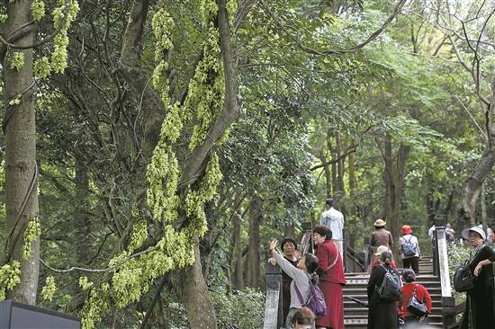 一串串青白相间的“雀鸟”缀满藤蔓,花瓣通透如羽翼,微风吹过,花浪起伏似万鸟振翅 羊城晚报记者 邓勃 邓鼎园 摄 |