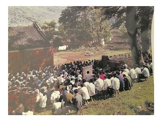 1983年,羊城晚报记者前往九嶷山学院采访,拍到乐天宇在山麓上碑刻旁给学生们上修身课 蔡俊荣 摄 |