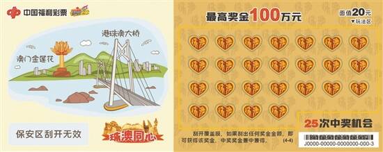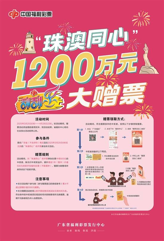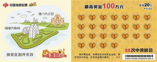 文/羊城晚报记者 黄颖琳 通讯员 莫冠婷 插图 采采 为纪念澳门回归祖国25周年,进一步宣传“珠澳同心”理念,广东以“刮刮乐”即开型福利彩票为载体,对珠海和澳门两地的地标元素进行组合,设计了“珠澳同心”主题即开票,并将于近日上市销售。 为庆祝“珠澳同心”即开票上市,广东省福利彩票发行中心自2025年3月20日0时起在全省(不含深圳市)范围内开展“珠澳同心”即开型福利彩票1200万元赠票营销活动。活动计划开展40天,至4月28日22时结束;如赠票活动资金在活动期间提前使用完毕,则活动结束,省福彩中心将向社会发出活动结束公告。 珠海首款地方特色票 3月20日,珠海市首款地方特色专题彩票“珠澳同心”在全省上市发行。“珠澳同心”主题即开票面值20元,共25次中奖机会,中奖金额由20元至100万元共14级构成。刮开覆盖膜,如果刮出任何奖金金额,即可获得该奖金。中奖奖金兼中兼得。 为何选中“珠澳同心”作为主题?票面设计有什么亮点?据介绍,此次“珠澳同心”福彩刮刮乐共有4款彩票票面,覆膜区图案使用的是珠澳字样和爱心图形,寓意“珠澳同心”;背景图取材于珠澳两地人文景观、地标建筑,具有一定的收藏价值和文化价值。 “多年来,珠海与澳门一直紧密联系、交流合作,共同为粤港澳大湾区的繁荣发展贡献力量。这是珠海的一个重要地域特色。”珠海福彩中心有关负责人表示,珠海地方票的发行,旨在通过福利彩票这一特殊载体,展示“一国两制”下珠澳两地人民同心同德、共谋发展的精神面貌,弘扬爱国主义精神,增强民族自豪感和凝聚力。 怎样参与活动? 值得注意的是,在广东省(不含深圳市)购买且在2025年3月20日0时后兑奖的“珠澳同心”即开票,即可参加本次赠票活动。 活动期间,对“珠澳同心”即开票单张彩票中得500元的中奖者,除兑付中奖奖金外,额外赠送1本(整本)价值500元的即开型福利彩票(不限票种),赠票为销售场所库存状态下的即开票。本次活动每个参与者(参与赠票登记的微信账号)累计不超过获赠价值3000元赠票。 怎样领取赠票? 活动期间,符合赠票条件的中奖者,按照以下步骤领取赠票: 1.关注“广东福彩”微信公众号,进入下方菜单栏【服务中心】选择【赠票活动二维码】功能菜单,并向福利彩票销售场所工作人员出示符合赠票活动条件的中奖彩票及“赠票活动二维码”。 2.销售场所工作人员使用即开票终端设备,先扫描中奖彩票的“保安(兑奖)码”,再扫描中奖者手机微信上的“赠票活动二维码”(活动期间,每个“赠票活动二维码”登记赠票金额不超过3000元),最后扫描赠送彩票的“物流条码”进行登记,信息登记成功后,销售场所工作人员将赠票交给中奖者。 广东省福彩中心温馨提醒,本次赠票活动时间以销售系统实际兑奖时间为准,符合条件的中奖者须在规定时间内到销售场所兑换赠票,逾期不兑换者视为本人自愿放弃。