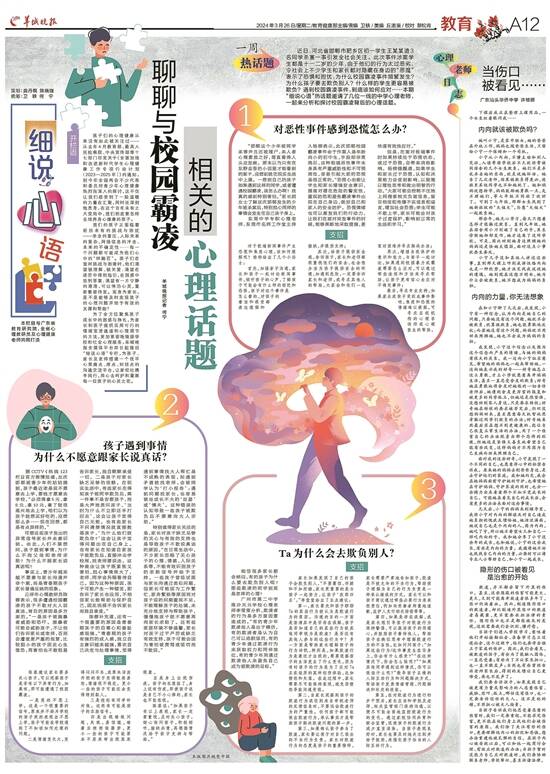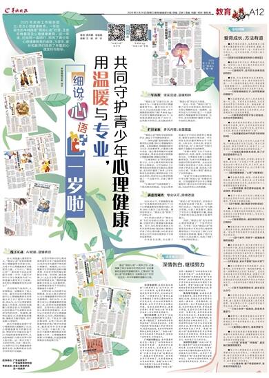 2025年政府工作报告提出,普及心理健康教育。一年前诞生的羊城晚报“细说心语”栏目,正是在做着普及心理健康教育。这一年来,它如同一盏明灯,照亮了青少年心理健康教育的道路,为学生、家长和教师们提供了丰富的心理支持与指导。