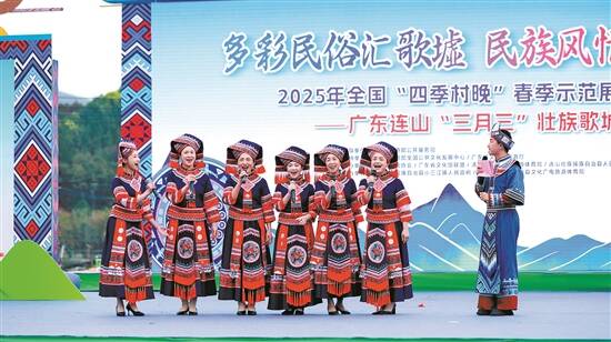 羊城晚报记者 李程 梁辉森 通讯员 吴颖 孔晓欣 唐震 3月30日至31日,2025年全国“四季村晚”春季示范展示活动——广东连山“三月三”壮族歌墟节活动在清远市连山壮族瑶族自治县小三江镇举行。此次活动吸引了粤湘桂三省(区)的民间“歌王”歌手同台斗歌,壮瑶歌舞精彩呈现,为游客带来了一场极具特色的民族风情盛宴。 各地山歌爱好者即兴对歌 “大众利(壮语大家好),壮家有个三月三,三月初三歌墟节呀歌墟节……”壮歌作为广东省非物质文化遗产代表性项目,在活动中欢快登场。小三江籍省级非遗项目壮族山歌代表性传承人梁联英及其壮歌队用壮语唱起“欢迎歌”,热情迎接游客。 连山“三月三”壮族歌墟节暨粤湘桂山歌邀请赛将活动氛围推向高潮。来自广东、广西、湖南等地的山歌爱好者与当地队伍围绕民族团结、乡村振兴等主题即兴对歌。 舞台上,选手们身着少数民族服饰,歌声或高亢激昂,或婉转悠扬,他们通过即兴编歌,巧妙地将生活感悟、民族情感融入其中,展现出深厚的山歌文化底蕴。 经评审,《天堂怎比我瑶家》《壮乡欢歌》凭借其出色的演绎荣获一等奖;《唱支瑶歌给党听》《山歌悠悠》《敬你一碗壮家酒》表现优异,获得二等奖;《好茶浓》《弹指歌》《连州山水好风光》《乡村振兴》《映山红》《三月念三姐》获得三等奖。 带来民俗歌舞美食多彩体验 夜幕降临,三联村的田野音乐会带来别样体验。音乐会特别邀请中山市原创音乐协会到现场弹奏,知名歌手和民谣诗人带来精彩表演。与此同时,歌墟广场篝火燃起,壮族青年邀请游客共舞,共度欢乐佳节。 另一边的田心村同样热闹非凡。漫山遍野的格桑花迎接游客,青年们拍打手鼓,游客参与竹竿舞。壮族儿女以酒“拦路”,热情款待八方来客。 当地的农特产品美食街也是热闹非凡,五色糯米饭、猪血酿、糍粑等特色美食飘香,连山的山珍干货备受青睐。文创产品区的壮锦瑶绣吸引众多目光,手工体验区让游客感受壮绣和传统美食制作的魅力。 据了解,此次“三月三”壮族歌墟节活动共有2.67万人次参与,带动消费1428.45万元。