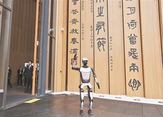 人形机器人在中国馆外向嘉宾招手致意 新华社发 |