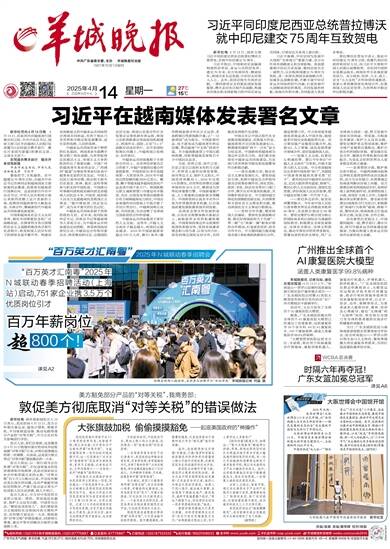 中共广东省委主管、主办 羊城晚报社出版 1957年10月1日创刊 2025年4月14日 乙巳年三月十七 星期一 27℃ 15℃ 责编/袁婧