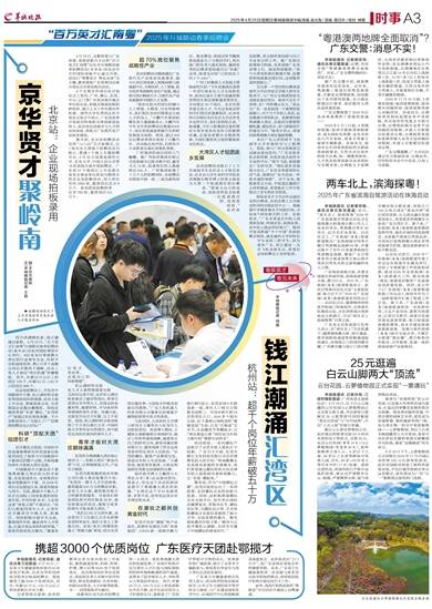 羊城晚报记者 何晶 四月西湖柳色新,珠江潮涌启新程。4月19日,“百万英才汇南粤”N城联动春季招聘活动(杭州站)在杭州国际博览中心举行。683家来自粤港澳大湾区的行业领军企业、科研平台和
