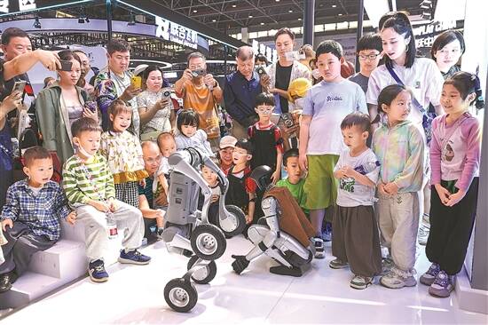小朋友在第五届消博会现场体验机器狗玩具 新华社发 |