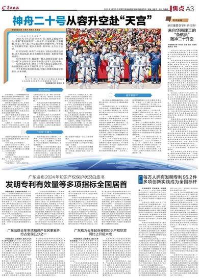 羊城晚报记者 李可欣 王倩 陈亮 王隽杰 通讯员 华轩 4月24日17时17分,神舟二十号载人飞船在酒泉成功发射。6条来自华南理工大学医学院的斑马鱼随3名宇航员一同进入太空,成为名副其实