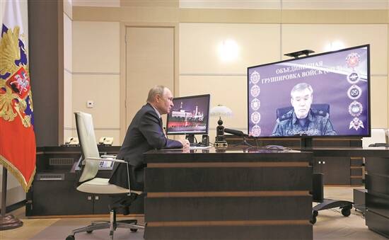 普京在听取俄武装力量总参谋长格拉西莫夫的汇报 新华社发