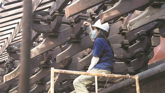 广东省文物考古研究院古建所工作人员在拍摄记录屋顶构造 |