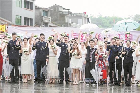 羊城晚报讯 记者鄢敏、通讯员岳青摄影报道:5月19日,素有“千年古镇 人间正果”美誉的广州增城正果老街迎来2025年广东青年集体婚礼。当天,100对新人在风景优美的南昆山麓、增江画廊,以青山为证、碧水为媒,唱响爱的主打歌,共谱“喜粤良缘 修成正果”的爱情诗篇。 “听我说,手牵手,跟我一起走……”现场,歌曲《今天你要嫁给我》响起,来自全省各行业领域的新婚佳偶陆续登场。他们当中,有扎根广州生活的香港青年、投身科研事业的外籍青年,还有少数民族青年、海归青年,也有人民警察、乡村教师、消防员、医护人员等。 集体婚礼过半,天空突然下起雨,仪式不得不暂停,但丝毫没有影响新人们喜悦的心情。“这个意外的天气感觉象征我们的爱情,要携手共度风雨,经历大风大浪后,才能见证彩虹。”一位新娘如是说道。雨势渐小,拍照点前就排起了长队,一对对新人共同撑着伞,希望留下珍贵、难忘的瞬间。