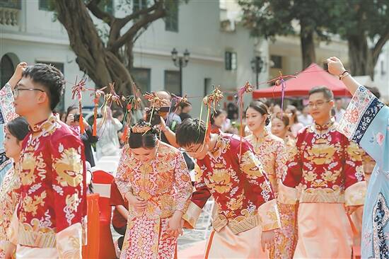 羊城晚报讯 记者马思泳、陈秋明,通讯员荔宣摄影报道:5月20日,“缘定荔湾·甜蜜相伴”520集体婚礼暨“甜蜜路线”发布会活动在广州荔湾举行,其中广府集体婚礼吸引了来自大江南北的20对新人参与。 刘先生来自东北,在广州工作了5年,他和来自广东潮汕的太太在前几天登记结婚,得知有广府传统集体婚礼,便报名参加。 “之前了解到荔湾区连续多年举办传统集体婚礼,婚礼是人生的重要时刻,我们这对‘南北结合’的夫妻日后定居在广州,想在广州这座城市以集体婚礼作为自己的正式婚礼,以广府婚礼纪念幸福时刻。”刘先生说,现在崇尚文明婚俗,在此次集体婚礼后,不会再大办婚礼,而是分别回双方老家,与亲人吃饭团聚。 活动现场,广府婚礼习俗非物质文化遗产市级代表性传承人、荔湾区婚俗文化馆广府婚礼习俗项目顾问卢燕武(八姑姐)作为“大妗姐”为新人主持传统婚礼。 “今年,我把我们家族关于广府传统婚俗的重要物品都挖出来,带到现场。”其中,新人过“荆铃门”就是卢燕武特别安排的。她说:“‘荆铃门’的文化历史可追溯至200多年前,‘荆铃门’挂有铃铛和荆棘,其中,铃铛是我们家族代代相传的物品。以前,‘荆铃门’是新娘的娘家为新人准备的结婚物品,新人结婚走过‘荆铃门’,寓意新人在婚后携手共进,协力同心面对困难。” 今年,卢燕武还以说唱形式为新人送上祝福,“说唱是广府婚礼仪式传统的祝词方式,结合了咸水歌、粤剧腔调等为新人送上祝福。” “一揖礼,乾坤交泰感念众;二揖礼,琴瑟和鸣情贵重;三揖礼,天地同心两心钟。”在卢燕武的引导下,20对新人完成了鸾凤三揖礼、千丝结缘礼、宣誓等中式婚礼仪式。卢燕武介绍,有一个环节是由新郎为新娘佩戴由柏叶、红绳组成的头饰,寓意感情常青、情意绵绵。 在“荔湾囍市”甜蜜经济市集,摆放有金猪牌、龙凤手镯、柚子水等多款婚庆用品。“今年,我们特意为新人准备了镀24k金的金猪牌,寓意新人多子多福;还准备了龙凤金手镯供新人抽奖。”卢燕武介绍,随着时代发展,婚俗物品也有了创新,比如开发了柚子喷雾水,可以用作洒柚子水的仪式,新人行礼前喷一下,寓意忘记过去不好的事物,精神地走进新生活。 活动中,荔湾区围绕“荔湾国潮民俗”“荔湾网红地标”和“荔湾婚俗传统”三大主题,推出“珠联璧合金银玉器展示线”“心心相印荔湾福地畅游线”“百年好合互动体验服务线”“永结同心甜蜜婚庆服务线”“爱是永恒互动体验服务线”“良辰美景互动体验服务线”六条特色甜蜜打卡路线,发挥“婚登+”引擎作用,带动周边经济,激发商圈活力。