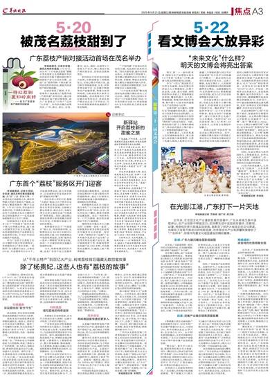 羊城晚报讯 记者王丹阳、全良波,通讯员粤交集宣摄影报道:美“荔”上新,甜蜜引擎。广东茂名是中国荔枝之乡,拥有世界最大的连片荔枝生产基地,全球每5颗荔枝便有1颗产自这里。5月20日9时,茂名高
