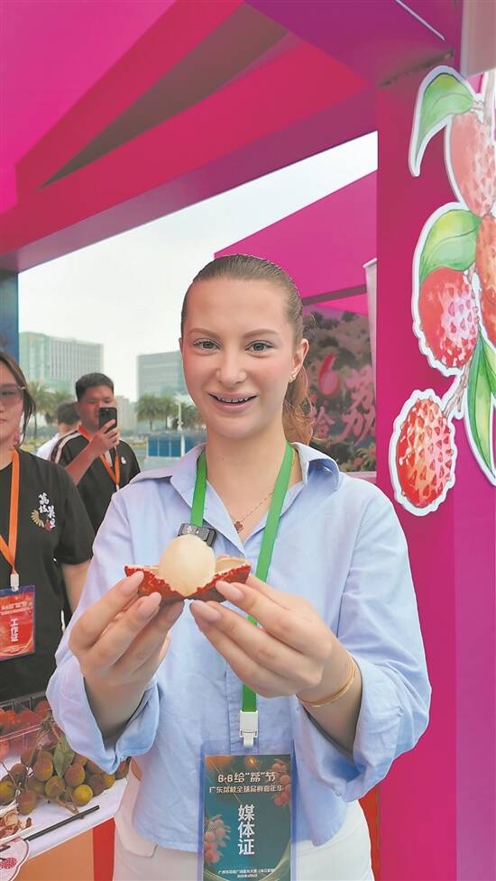 文/羊城晚报记者 刘泳希 赵鹏 图/羊城晚报记者 温泽广 “我来中国后第一次吃到荔枝,希望把这份甜蜜分享给世界各地的朋友!”6月6日下午,受羊城晚报“iSeeChina”栏目邀请,来自乌克兰的广东外语外贸大学留学生娜娜走进“6·6给‘荔’节——广东荔枝全球品鲜嘉年华”,化身“荔枝探鲜官”,沉浸式打卡不同品种的荔枝、荔枝饮品和荔枝文创,领略一颗荔枝背后的岭南风味与文化魅力。 广东是世界最大的荔枝产区,眼下正值荔枝成熟丰收季节。走进嘉年华现场,扑鼻而来的果香和满眼鲜红的荔枝便让娜娜惊喜不已。她兴奋地逐一品尝“桂味”“妃子笑”“白糖罂”等来自茂名高州的代表性荔枝品种,边吃边点赞:“我最喜欢白糖罂,特别甜,而且核还小!” 摊位负责人何辉亮向她介绍道,茂名高州是广东著名的荔枝产区,当地种植荔枝已有上千年历史,白糖罂是其中最具代表性的传统品种,以果色鲜红、肉质香甜著称,是不少食客的“心头好”。 更令娜娜惊喜的是一款无核荔枝。“第一次吃到没有核的荔枝,吃起来更方便了!”她说。来自中荔集团市场部的冼子鹏介绍,这款无核荔枝在欧美市场深受欢迎,尤其在美国,每年荔枝季出口量达3.5万千克左右,若算上整个欧美市场,总量可达7.5万千克左右。 娜娜听后充满期待:“我希望将来在乌克兰能买到中国的荔枝,让我的家人朋友也能尝一尝我最爱的中国水果。”冼子鹏回应说:“我们正在考虑拓展乌克兰市场,希望不久之后,乌克兰的朋友也能吃到来自中国的荔枝。希望把这颗中国味道带到世界更多的地方。” 除了鲜果,现场还有丰富的荔枝衍生产品展示区。娜娜品尝了一款结合广东茶叶与荔枝果味的饮品,赞不绝口:“酸甜刚刚好,还有淡淡的茶香,特别适合夏天。”据喜茶品牌相关负责人赵芯竹介绍,这款饮品灵感来自今年的荔枝丰收,旨在将本地水果与茶文化相结合,打造更具岭南特色的创意饮品。 逛展过程中,娜娜还发现了正在进行直播带货的摊位。“我平时就爱看电商直播购物,如果看到这样展示荔枝的直播,我肯定会忍不住下单。”她笑着说。琳琅满目的荔枝文创也吸引了她的注意:荔枝图案的冰箱贴、团扇、广彩瓷盘……她还亲手为一只广彩盘绘上荔枝纹样,兴致勃勃地了解起这项传统技艺的历史。 这次体验让娜娜感触颇深:“没想到,一颗荔枝不仅仅是水果,还能成为饮品、文创,甚至是文化交流的载体。”她说,她会把这份“甜蜜”带回去,让更多朋友了解荔枝,了解广东。