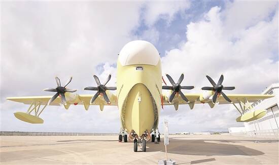 11日,在珠海中航通飞华南飞机工业有限公司,现场展示的批量生产的首架AG600飞机 新华社发 |