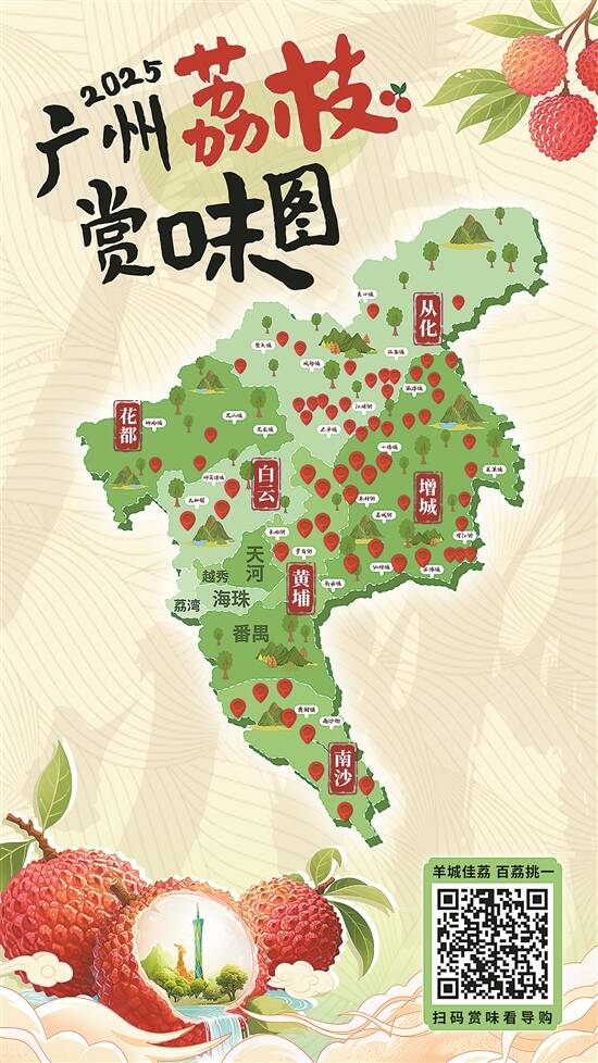 羊城晚报记者 许悦 通讯员 穗农宣 夏至将至,广州荔枝季到了!今年广州荔枝产量预计12万吨,其中桂味、糯米糍、仙进奉、井岗红糯、流溪红荔等中晚熟优质品种占比近七成,将于6月下旬大量上市。19日,广州市农业农村局发布“广州荔枝赏味图”,打造全城荔枝资源的“一站式导航”,市民扫码还能查询到14条主题采摘路线。 广州荔枝为何好? 荔枝界有句行话:世界荔枝看中国,中国荔枝看广东,好吃荔枝在广州。 为什么说好吃荔枝在广州?原国家荔枝龙眼产业技术体系首席科学家、华南农业大学教授陈厚彬从科学角度给出了解读:“广州荔枝尽享天时地利。” 据陈厚彬介绍,广州地处北回归线上,广州荔即“夏至荔”,荔枝果实发育期尽享日光照射,山地和树冠四面均匀享受阳光,各个方位荔果均同等地高品质发育。同时,广州地处珠江三角洲,冲积土壤肥沃深厚,荔枝有着天然而丰富的营养供给。高品质的土壤和生态水平,确保了广州荔枝的最好滋味。 其次,广州荔枝有享誉世界的悠久种植技术沉淀。20世纪格洛夫(Groff)教授(园艺教授、专家)在岭南大学任教,就撰写了世界第一本荔枝英文专著,介绍广州荔枝种植技术。如今加上当代科技加持和赋能,广州荔枝得到最好的树体护理、整枝修剪和营养管理,荔枝糖度酸度恰到好处,少了一丝酸、多了一分甜,香气浓郁、鲜甜好吃。 此外,广州还是近现代许多优质荔枝品种的起源地和演化地。如增城挂绿、仙进奉、井岗红糯,以及桂味、糯米糍等。广州尤其是大批焦核荔枝品种的演化地。广州先民采用“空中压条”(一种繁殖荔枝树的有效方法)方式,把这些优异性状的基因资源固定下来,传承至今,使得广州成为公认的这些美味荔枝的最适宜产地。 如何开启深度荔乡行? 想吃上广州好荔枝,只需扫码开启2025年广州荔枝赏味图,就能踏上充满甜蜜与惊喜的荔枝之旅。 赏味图整合了广州近200家对外开放的优质荔枝果场信息,涵盖现场采摘、线上下单、大宗采购全场景需求,让选择更自由。 图上还列明果园地址(一键导航)、联系方式(一键拨号)、供应品种、上市时间、交通条件等实用信息,帮助消费者预判采摘档期,不错过最佳赏味期。今年还新升级“品牌优选”标识,清晰标注国家地理标志产品、“粤字号”品牌、名特优新农产品等,品质看得见。 此外,赏味图还新增特色旅游推荐,结合荔枝产区周边生态景点、农家乐、非遗文化体验等,规划14条主题采摘路线,从“一日尝鲜游”到“深度荔乡行”,满足不同游客需求。
