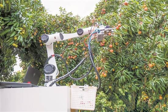 羊城晚报记者 李钢 马灿 荔枝园内,一台履带式机器人缓缓来到了一棵荔枝树下,伸出前端的机械爪,准确地“抓住”荔枝枝条,将成熟的荔枝果“摘下”。谁能想到,在无数古诗词中出现的“岭南佳果”如今正奏响着现代技术的新乐章。 19日,岭南果园荔枝智慧化管理技术推介会在从化荔博园举行,AI大模型、智慧果园精准管控技术、多农机协同作业体系等成果在这里亮相。 机器人每分钟可摘60颗荔枝 由华南农业大学熊俊涛教授团队研发的六自由度机械臂搭配仿生柔性夹爪的采摘机器人,成为了当天的“明星”。 熊俊涛告诉羊城晚报记者,采摘机器人的研发要攻克识别、控制、运输三大课题。通过视觉传感器,机器人可以“看到”荔枝果实的位置;通过精准的控制技术,机器人的机械臂能实现精准的作业路径规划,从而不差分毫地将荔枝果剪下;同时,还要实现与运输小车的协同作业能力,在自带的果篮装满后,将果实准确地放入运输小车中,清空果篮,继续作业。 据了解,采摘机器人每分钟可采摘60颗荔枝,且做到了损伤率低于3%。 熊俊涛表示,采用换点技术的采摘机器人可以全天候24小时不间断地工作,其每天的费用为两三百元,相比起人力采摘成本降低了约一半。 据介绍,目前广东已经有5个城市开始进行采摘机器人的示范性应用。 智能化体系支撑自动采摘 采摘机器人的背后,是一整套协同系统的体系化支撑。 在荔博园内,自动巡检机器人和地面巡检机器人每天按照规定好的路径进行自动巡检,并且对荔枝树拍摄高清照片,上传到智慧果园管理平台。在这里,训练成型的AI大模型将大显身手:判断果实的成熟度,一旦“荔知君”(华南农业大学国家精准农业航空施药技术国际联合研究中心等单位联合研发的AI大模型)判定果实糖度达到18°Bx、果色转红80%时,就会发出指令,然后就进入到采摘机器人的“表演时间”。 穿梭荔枝树间,负责运输的则是搭载北斗导航的无人运输车“智能荔枝使”。它单次运输200公斤,日运量达3.5吨,并确保果实运输中全程无损。 其后,无人运输车将会把采摘下来的荔枝运送到在荔枝采摘区旁的田头车间里。在这里,由华南农业大学郭嘉明教授团队研发的冰水喷淋保鲜设备正等着这些鲜美的果实。 刚采摘的荔枝送达车间,车间工人立即将果实送入喷淋隧道,零下5℃的冰水混合物以0.8MPa的压力均匀喷洒,配合内置的超声波雾化系统,使荔枝果心温度从30℃降至5℃仅需10分钟,结合气调包装,使常温保鲜期延长至72小时,冷链保鲜期达28天,彻底突破“荔枝一日而色变”的千古难题。