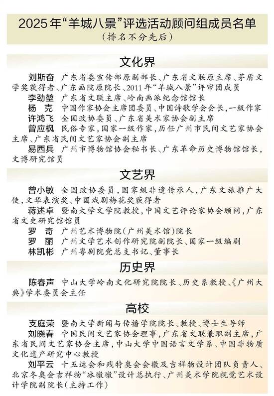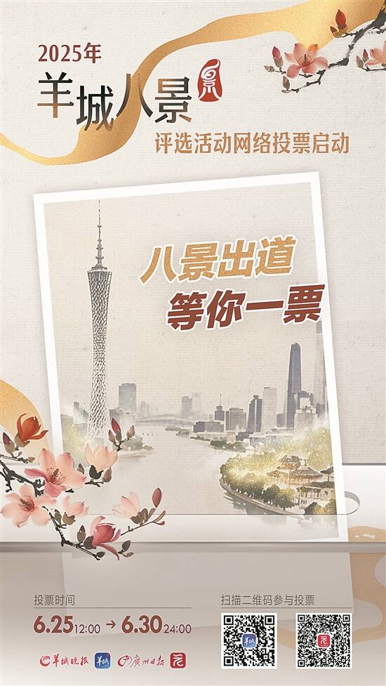 羊城晚报记者 罗仕 李焕坤 千年城脉,八景流芳。为迎接十五运会和残特奥会,进一步推介广州文化旅游资源,4月11日,2025年“羊城八景”评选活动正式启动。经过近两个月的报名和初评,确定全市70个景点(区)参与评选。今日12时起,评选活动开启为期5天半的网络投票,快来为你心水的景点(区)投票打Call。 根据活动安排,在网络投票环节结束后,活动组委会还将举行专业调研、终审座谈会、“羊城八景”命名、名称网络投票等活动,最终评选结果将于8月1日发布。 全市70个景点(区)参评 作为广州的千年IP,“羊城八景”以山水为骨、人文为魂,评选始自宋朝年间,宋、元、明、清历代相沿,从未间断。新中国成立后,又分别于1963年、1986年、2002年、2011年进行了四次评选。 今年4月11日,在广州市政府牵头推进下,由广州市文化广电旅游局、十五运会和残特奥会广州赛区执委会新闻广电宣传部共同指导,羊城晚报报业集团和广州日报报业集团联合主办的2025年“羊城八景”评选活动正式启动,集媒体之力、发文化之声、聚市民之意,评选出新时代新广州的“羊城八景”。 记者从活动组委会了解到,经过近两个月的社会征集,收到广州市11个区共70个景点(区)报名(各区推荐的景点66个,自荐景点4个)。其中,越秀区遴选推荐景点(区)8个、海珠区2个、荔湾区4个、天河区5个、白云区8个、黄埔区8个、花都区8个、番禺区8个、南沙区2个、从化区5个、增城区8个。花城文学院、广州图书馆、广州神农草堂中医药博物馆、香草世界等4个景点(区)自荐申报。 在报名的景点(区)中,既有广州塔景区、越秀公园、白云山风景名胜区等广州的老牌景点,同时也有西关永庆坊旅游区、广州白云站、广州国家版本馆等近年涌现出来的新地标。 网络投票持续至6月30日 “羊城八景”镌刻着时代发展的烙印,也凝聚着市民对城市的热爱与自豪。 此次评选活动不仅是文旅界的盛事,更是全民参与的公共文化行动。评选活动坚持“人民城市人民评”的理念,通过“线上投票+市民参与+专家评审”的方式,评选出新的“羊城八景”。网络投票的情况,将是评选“羊城八景”的重要参考。 记者从活动组委会了解到,6月25日12时至6月30日24时,市民可通过羊城晚报羊城派客户端、广州日报新花城客户端,广州市人民政府门户网站、广州市文化广电旅游局官方网站,以及“广州政府网”“广州市文化广电旅游局”“羊城晚报”“广州日报”“爱游广州”微信公众号、微博等渠道参与网络投票。 进入投票界面后,市民点击各行政区名字,即可查看各区参评的景点(区)及其详细介绍(排名不分先后),点击投票按键,即可实现投票。根据投票规则,每位市民每天可投票3次,每人每天一共可以投24票。 顾问组评审组成员名单公布 除了网络投票,专家评审得分也是评选2025年“羊城八景”的重要依据。在网络投票启动的同时,活动组委会同步向社会公布了评选活动顾问组、评审组成员名单(详见表格)。 记者了解到,此次评选活动顾问组由15位专家学者组成,分别来自文化界(6位)、文艺界(5位)、历史界(1位)、高校(3位)。广东省委宣传部原副部长、广东省文联原主席、2011年“羊城八景”评审团成员刘斯奋担任评选活动顾问组组长。 评选活动评审组由30位专家学者组成,分别来自文化界(10位)、文艺界(3位)、高校(6位)、建筑设计界(3位)、经济界(4位)、文旅协会(4位)。中国晚报协会学术委员会副主任、广东省文化学会会长、省政府参事室特约研究员周建平担任评选活动评审组组长。 评审组成员将于 6月30日到7月8日分组前往广州市11个区的参评景点(区)进行实地调研,聚焦历史人文之韵、生态自然之美、时代发展之新、产业集聚之力、公众喜爱度等维度,为每个景点(区)打分。 7月11日,活动组委会将举行“羊城八景”终审座谈会,综合评分情况和网络投票情况,评选出2025年“羊城八景”。顾问组成员将对申报景点进行建言献策及命名指导。 8月1日,结合十五运会开幕式倒计时100天活动,将举办2025年“羊城八景”发布仪式,公布新羊城八景。