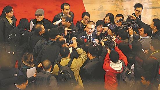 2012年11月8日,党的十八大开幕会后,十八大代表赵广军受到记者围堵采访(资料图) |