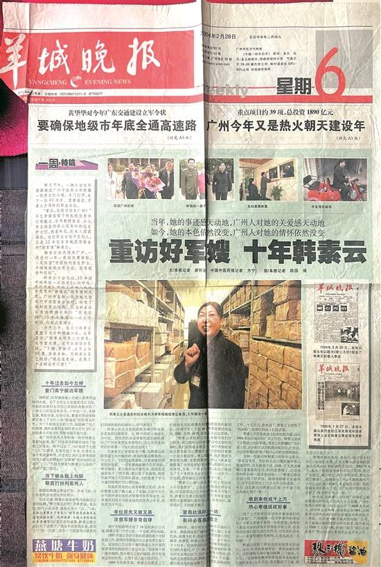 2004年2月28日,羊晚头版《重访好军嫂 十年韩素云》报道。包括这张报纸在内的诸多报道,韩素云夫妻俩珍藏至今 羊城晚报记者 丰西西 摄 |