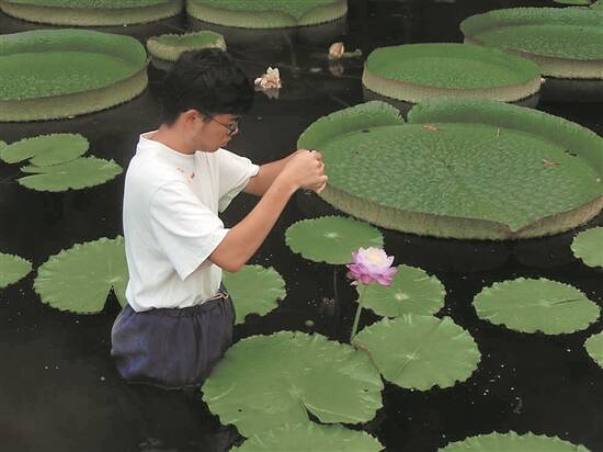 文/羊城晚报记者 谢小婉 图/受访者提供 炎炎夏日,赏荷爱莲正当时。在广州番禺莲花山旅游区,超1200种荷花、近600种睡莲珍品次第盛开,其中最惹人注目的,当数荷花品种“林亭春霭”。其入眼便是一池“金荷”,花叶相宜、映日摇风,不少市民争相拍照,称其既有荷花的清新,又有牡丹的贵气。 “林亭春霭”的培育者是今年23岁的广州人陆炜桦。2022年,陆炜桦像往常一般爬上梯子,探身到自家天台察看栽种的植物,头一抬,就看到好几朵开得正好的荷花,金灿灿的。“比去年刚育种时开得好,我就安心了。”次年,这种“金荷花”便开始在莲花山试种,直到今年满池栽种。 荷的盛放,在今时炎夏满开一池,也占据了陆炜桦过往的一半人生。 初中开始种荷花 陆炜桦小时候就亲近自然,走在路上乐于辨认路边植物品种,回家爱跟在奶奶身后栽花种菜。“广州是花城,家家户户在楼顶种花种菜,是非常常见的事情。”他在自家阳台和天台上种满多肉、波斯菊、百日草、狗牙花等各样植物。“小时候就是观赏,单纯享受栽种的乐趣。” 直到2013年,陆炜桦在荷塘边捡到一支被丢弃的莲蓬,莲房青青,内里的莲子却已变黑。他将莲子破壳泡水,没想到最后发芽了。突然的惊喜让他从此对这种生物情有独钟,于是在自己的“植物园”里先后养了十几个碗莲品种。 后来,经老师鼓励,陆炜桦加入中国睡莲产业联盟,得到不少前辈及同行的指点和支持。受知名睡莲育种专家李子俊的启发,他也决心在自家楼顶上,培育出自己的睡莲品种。 在睡莲和荷花的育种实践中,不少品种在经历高度杂交过程后会出现败育现象。因此,为了评估不同品种作为亲本的可行性,陆炜桦自费引种,慢慢积攒各类盆花。从读初一时阳台上的十几盆,到渐渐摆不下搬上天台,最后在他上大一时,天台上已育有140多盆不同品种的睡莲及荷花。 “高中我住校,周末才放假,如果是别的植物,一星期不浇水早就养不活了。但睡莲和荷花养在水缸里,我一周浇一次水,它就能一直活。”好养活、不费事,陆炜桦这样打趣自己执着于水生植物的原因。 事实上,睡莲及荷花大多在白天开放,为了筛选出最适宜当亲本的品种,陆炜桦曾花近三年时间,顶着大太阳对上百个品种一一进行人工授粉。有时花朵开放,正好是课业繁重时,闲余时间不多,他每每在午休时候坐地铁奔回家中做育种杂交工作,“饭也舍不得吃,灌一碗白糖水,就爬到天台上去了”。 花五年培育一株新荷 2018年,陆炜桦成功培育出自己的第一个睡莲品种“薰衣草薄雾”,这时他才高三。3年后,该品种完成国际登录(国际登录权,是鉴别、判定花卉植物知识产权的母权,新品种通过后方能得到国际承认),并随后在第二届全国睡莲新品种竞赛中,获得广热带睡莲组冠军和比赛总冠军。 在这期间,陆炜桦有了新的想法。“很多黄绿色的荷花到了广州后,不适应我们这边的气候,主要是不耐热。比如3月份种下去,5月份就没有花了,花期非常短,我很想解决这一问题。”为了测试是否所有黄绿色的荷花都不耐热,陆炜桦引进多个品种在天台栽种。“没有很大的地方给我,就是50多平方米的小天台,一盆盆摆满。”他说道,“其实也有好处,楼顶都是水泥地,顶多贴点瓷砖瓷片,在高温曝晒下更加吸热,有助于去筛选符合我预期的杂交亲本。” 这一步骤听起来容易,好似只需完成栽种即可,但其实陆炜桦是给自己挑选了一个难题。国人印象中的荷花大多为红色、粉色及白色,这也是亚洲莲的代表颜色。黄色荷花多为美洲莲,二者杂交后,黄色常不显性,故而要让一朵荷花即耐热又呈现黄色,极富挑战。 在楼顶的高温环境下,即使栽种上百盆,最终能开花的并没有多少,有时只能留下一两盆。花费近两年时间,陆炜桦才完成筛选亲本这一步骤,而后又花了一年做杂交育种工作。 2021年,在学校的陆炜桦给父亲打了个电话,说有一株荷花要开了,让爸爸帮他拍下照。很快,陆炜桦看到了照片。“我一直住校没法亲自养护,就是我爸浇个水,也没有施肥。那株荷花看起来瘦瘦小小的,但长出来的花很多,每一朵的花瓣也很多。”这就是他培育出来的新品种——“林亭春霭”。 这一年收获后,陆炜桦把得到的种子又播种下去。2022年荷花花季时,他爬上天台,一眼就看到成长得更为茁壮挺拔的“林亭春霭”,金灿灿的非常耀眼。次年,该品种在莲花山试种、观察,先在盆栽种,再换到小池子,直到今年在大池子中开满。这株新荷的盛放,前后花费陆炜桦近五年的时间。 已培育出四十多个荷花新品 陆炜桦高考后进入仲恺农业工程学院就读环境设计专业。大学期间,他在该专业取得优异成绩,研究生时跨专业考进湖南农业大学,攻读园艺学。“我在两条路上分别走过,最后选择了更为适合我的一条。设计与园艺两个专业知识并不割裂,反而在实践中相辅相成,但相比起在电脑前画图,我更喜欢育种的过程。”陆炜桦提到,“栽种植物,就是把大自然引到身边,在浇水、杀虫、施肥等不同工序后,我能有所收获,不仅是获得一朵花、一个果实,还得到了精神上的收获。” 陆炜桦在一段时间里,是旁人眼中的“怪人”——“只会闷头捣鼓植物”“不务正业”“白费功夫”……顶住种种压力,他始终坚持。通往楼顶天台的路,其实没有层级而上的楼梯,只有一把铁梯子。在最初的三年时间里,百来盆荷花、睡莲的土壤都是陆炜桦自己背着,慢慢