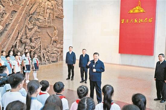 7月7日至8日,中共中央总书记、国家主席、中央军委主席习近平在山西考察。这是7日下午,习近平在位于阳泉市狮脑山的百团大战纪念馆考察时,同前来参观的青少年学生和纪念馆工作人员亲切交流 新华社发 |