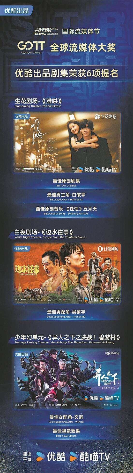 第30届釜山国际电影节本周公布2025亚洲内容大奖&全球流媒体大奖入围名单,优酷出品的3部剧集荣获6项提名。其中生花剧场《难哄》获最佳原创剧集、最佳男主角(白敬亭)、最佳原创音乐(《任性》—五月天)提名;白夜剧场《边水往事》获最佳男配角(吴镇宇)提名;少年幻单元《异人之下之决战!碧游村》获最佳女配(文淇)、最佳视效提名。 据了解,《难哄》播出期间同步登陆奈飞全球190多个国家和地区,刷新中剧在奈飞的播出纪录,位列多地区榜单第一;《边水往事》豆瓣开分8.1分,成为2024年国产悬疑剧开分最高作品,王安全的饰演者蒋奇明斩获第30届白玉兰奖最佳男配角奖;《异人之下之决战!碧游村》近日豆瓣评分上涨至8.4分,成今年国剧口碑最高之作。 据悉,第30届釜山国际电影节将于9月17日至9月26日在韩国釜山举办。亚洲内容大奖是由釜山国际电影节主办的颁奖典礼,于2019年设立,以亚洲地区制作并播出的优秀电视剧和流媒体平台节目为授奖对象。自2023年起,亚洲内容大奖更名至“亚洲内容大奖&全球流媒体大奖”,授奖范围扩大至全球流媒体平台内容领域。 文/羊城晚报记者 胡广欣 图/主办方提供