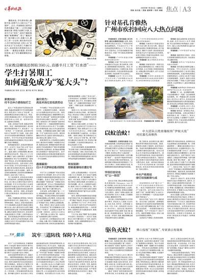 羊城晚报讯 记者陈亮报道:基孔肯雅病毒传播,白纹伊蚊成为致病“信使”。近日,记者采访中山大学中山医学院病原生物学与生物安全学系副教授、中大“蚊子工厂”技术总监张东京了解到,其团队正努力“以蚊治蚊”:一边释放经辐照的绝育雄蚊,让野生雌蚊“绝育”;一边培育不吸血的华丽巨蚊,让其幼虫吞噬白纹伊蚊幼虫。这两种创新生物防治技术即将联手,7月30日在佛山三水南山镇展开实战,为阻断蚊媒传染病传播筑起科技防线。 华丽巨蚊幼虫 可“以一敌百” 张东京介绍,基孔肯雅热是由基孔肯雅病毒(Chikungunya virus)引起、经伊蚊(主要为埃及伊蚊和白纹伊蚊)传播的急性蚊媒传染病,以发热、关节剧痛为主要特征,影响民众健康与社会秩序。此次广东佛山疫情主要由白纹伊蚊(花蚊子)传播,只有雌蚊才吸血,雌蚊体型中等。 据介绍,白纹伊蚊偏好在小型容器中孳生,常见有人工容器(花盆托盘、水桶、轮胎、塑料瓶)、自然容器(如树洞、竹筒、叶腋)、其他类型(屋顶积水、排水管道)。张东京说,蚊虫的生活史包括四个阶段,蚊卵-幼虫-蛹-成蚊,前三阶段都需要有水,“离开水,蚊无法进一步发育,因此,翻盆倒罐是减少蚊虫孳生地的主要措施”。 除了清积水,还可利用天敌、微生物农药等生物防治技术防蚊。据悉,伊蚊的天敌除了食蚊鱼,还有华丽巨蚊。华丽巨蚊的雌雄成蚊均不吸血,以植物汁液和花蜜为食。张东京团队正在开展其幼虫的捕食研究。团队在野外调查发现,华丽巨蚊的孳生环境与伊蚊幼虫高度重合。“我们目前已经能在实验室构建华丽巨蚊的完整生活史,发现一条华丽巨蚊幼虫一生至少可以吃掉80条-100条伊蚊幼虫,具有良好的防治效果和效率。”张东京指出。 中大产绝育蚊 使叮咬指数降七成 在东莞的中山大学“蚊子工厂”(广州中大核昆生物技术有限公司)里,一场关于蚊媒防控的“高科技生产”日夜不停。这个占地1000平方米的“产房”,每周能“孵化”出400万-500万只特殊雄蚊——它们是白纹伊蚊的“绝育战士”。 张东京介绍:“过去15年,我们团队一直在开展‘以蚊治蚊’,即释放经辐照或沃尔巴克菌的白纹伊蚊绝育雄蚊,让它们与野生雌蚊交配,使产下的后代无法发育。一次有效的交配可以降低雌蚊一生产下的200个-300个后代。我们控制媒介蚊虫,实际上就是在控制基孔肯雅热。” 从附着在产卵纸上的黑色蚊卵,到孵化管中游动的幼虫,再到经自动化设备精准分离的雄蚊蛹,每一步都透着精密——雌雄分离仪能区分仅1毫米宽的差异,让混雌率低至0.1%;X射线辐照仪则像“手术刀”,450秒内就能让雄蚊丧失繁殖能力,却不削弱其交配竞争力。这些“绝育兵”羽化成蚊后,会被送往野外释放,与野生雌蚊交配、使其“断子绝孙”。建厂4年来,这里已累计产出数千万只绝育雄蚊,成为环保防控蚊媒传染病的“超级工厂”。张东京介绍,“过去4年,我们一直在广州老城区小范围释放经辐照的绝育雄蚊。我们发现,因有绝育雄蚊的存在,释放区的雌蚊叮咬指数下降了70%-80%。” 2023年-2024年,张东京曾连续两年在夏天带领研究生、本科生,在佛山三水南山镇塘背村开展为期一个月的野外蚊虫监测,主要开展蚊虫标记-释放-重诱捕实验,对绝育雄蚊在野外的寿命、扩散能力以及当地白纹伊蚊种群数量进行评估。 张东京透露,近期团队打算将两种生物防治技术结合起来,在佛山三水南山镇的村庄开展对当地白纹伊蚊种群防控:“7月30日,我们将协助当地开展防蚊灭蚊工作,并向野外回放华丽巨蚊幼虫。这些幼虫均采自当地,后在我们实验室培育,现在是它们重新回到野外参与对伊蚊防控的好时期。后续经与当地政府、疾控部门和居民充分沟通后,再释放绝育雄蚊。”