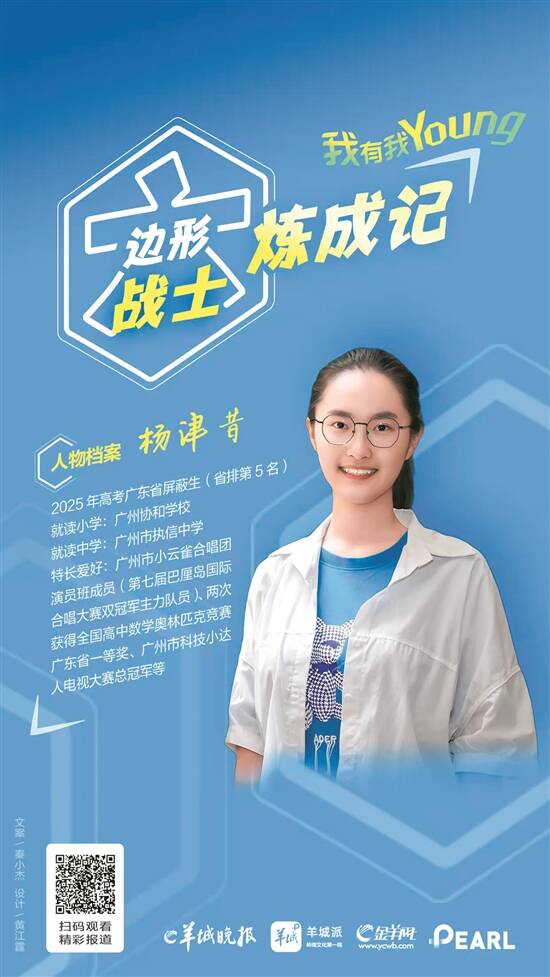 羊城晚报记者 何宁 人物档案 杨津昔 2025年高考广东省屏蔽生(全省第5),小学就读广州协和学校,中学就读广州市执信中学 学术竞赛荣誉: 第七届巴厘岛国际合唱大赛“双冠军”主力队员 两次获全国高中数学奥林匹克竞赛广东省一等奖 曾获广州市科技小达人电视大赛总冠军 今年高考放榜后,杨津昔作为“屏蔽生”引起关注,熟悉她的人翻出有关她的报道——这个“明星学生”学业稳居前列,声乐、钢琴功底扎实,科创表现亮眼,初三时还成为当年广州唯一入选“北京大学全球精英人才A计划”的学生,也是该计划屈指可数的初中生。 各类奖项列出来能“铺”满一张A4纸,加之情商高、外形阳光,杨津昔被家长们称为“杨女神”。但优秀的背后是为目标倾尽全力的每一天。高三后半程,她每天6时30分左右起床后写一篇高考作文,这份执行力正是“六边形战士”的底色。 “唯有尝试磨炼才能拥有” 五年级时,杨津昔作为“小云雀合唱团”演员班成员,随团获第七届巴厘岛国际合唱大赛“青少年组”与“民谣组”双冠军。“我们常常练习到深夜,为在半小时休息时间内吃饭,跑遍了附近美食店。”大巴上的和声、街灯下的盒饭、后台传递的润喉糖与鼓励,拼凑成她珍贵的记忆,也为她打下了扎实的声乐基础。 “杨津昔10岁时随团出国演出,‘小云雀’的优秀氛围激励着她向卓越看齐。”杨津昔的妈妈说。 杨津昔四年级参加了科技小达人电视大赛,这个海选时紧张的女孩,对着镜子一遍遍练习演讲、辩论与才艺,最终夺冠。“当时觉得是‘酷刑’,现在才知是礼物。”杨津昔明白,有些能力唯有尝试磨炼才能拥有。 “把不想做的事做到极致” 作为艺术特长生,杨津昔考入执信中学。与从小学奥数的同学不同,杨津昔初中时才接触竞赛知识,初三时她深感天赋差距:“上课时跟不上老师节奏,同学热烈讨论时,我插不上话。” 杨津昔坦言,天赋是客观存在的,“舞台上有些人稍加点拨,就能在韵律中融入理解,这是悟性的差距。”但她释然道:“不觊觎他人天赋,专注编织自己的网,才能拥有真正的自己。” 关于天赋与勤奋,杨津昔认为没有标准答案,“天赋或许决定领域的下限、上限和成长速度,但价值在奋斗中实现,不必过度比较。”高考更考验高压下的节奏与执行力,“这些全凭锤炼,能把不想做的事做到极致,才是核心竞争力。” 对于数学的学习,杨津昔坦言,她90%的精力扑在130分的基础分上。刷题分两类:一是“纠错卷”,老师针对常错点出题,“100分卷有时只考七八十分,为‘吃一堑长一智’”;二是“强化卷”,“高二练立体几何时,两周内每天练5—8道题,每道计时10分钟,快速练习能养成肌肉记忆,这是刻意训练的力量。” “高质量做事需全身心投入” 杨津昔自称是“目标导向型”,“认定一事就要全力以赴,长久专注。”但她也很清醒:“为目标舍弃其他,可能磨损锋芒。” 中学后,杨津昔对艺术的投入时间减少,但热爱未减,她即兴参加全国青少年音乐素养大赛,就荣获省一等奖并进入全国总决赛。杨津昔还喜欢文学经典、ACGN和Kpop,偶尔打游戏。她认为,合唱经历让自己保持艺术审美,“对身心平衡重要,也助于语文、英语的艺术鉴赏。” 二模时,受流感影响,杨津昔的成绩有所退步。“《就是哪吒》的唢呐声让我想起电影和导演接受采访的画面,我放下了执念,用热忱面对最后一个月。” “兴趣是精神内核的一部分。”杨津昔总结道,“突破自我时,需要一点理想主义和热血才能熬过艰辛。” 杨津昔认为,高三平衡学习与兴趣的核心是“对自己负责”,“高考前会放下兴趣,全身心备考”,“高质量做事需全身心投入,一件一件完成更高效。” 对学弟学妹,杨津昔建议:“重心在学习上,兴趣多是精神出口。大考前要静心,舍弃才能收获。把能做的做好,得到能得的,就是好的结果。”
