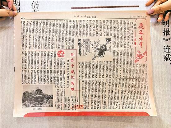 文/图 羊城晚报记者 黄宙辉 方可茵 2025南国书香节期间,“金庸武侠文学创作七十周年纪念展”亮相武侠馆,一批珍贵展品引发关注,其中尤为引人瞩目的是1984年10月《羊城晚报(港澳、海外版)》连载《飞狐外传》的第1期和第2期原件。 1955年,金庸先生开启了他的武侠文学创作传奇。70年间,其作品风靡海内外,滋养了几代读者。朗声图书总编辑何娴介绍:“从1984年10月21日起,金庸先生的作品《飞狐外传》在《羊城晚报(港澳、海外版)》连载。据我们目前收集到的信息,该连载共刊出4期。” 何娴进一步介绍:“最初金庸先生同意连载的是《碧血剑》,但最终见报的却是《飞狐外传》。”这段插曲,为这段文坛佳话增添了一丝趣味。这次授权,不仅实现了金庸作品的海外传播,更见证了一段深厚的友谊。