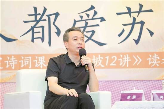 8月17日上午,北京师范大学教授、《百家讲坛》的明星主讲人康震做客南国书香节现场,围绕他的新作《康震诗词课:苏东坡12讲》,带现场读者粉丝一同解码与岭南有着不解之缘的苏东坡的“顶流”人生。 “书写苏东坡是我靠近这位千年知己的唯一方式。每个热爱苏东坡的人都有权利去写他,其实不必成为作家,只需要自由地书写内心,就很美好。”他鼓励现场在座的每一位喜爱苏东坡的观众写下自己心中的苏东坡。 在康震看来,苏轼从苏子瞻到苏东坡的转变,本质上是文化人格的淬炼过程。尤其是苏轼在黄州时期完成的精神蜕变,展现了中国士大夫文化自觉的最高形态,即在低谷发出高音的生命力。“苏东坡告诉我们,无论晴雨,‘一蓑烟雨任平生’,放轻松,走踏实,不要太得意,也不用太失意,从容踏实地前行,这就是最大的福报。” 康震生动的讲解和接地气的语言让现场多次爆发出掌声和欢笑声,然而活动最精彩的瞬间出现在观众互动环节。一位读者向康震问好,接着打趣道“今天我没穿制服”,康震立马认出了他。 原来他是《2023中国诗词大会》总冠军、南航机长马保利。他的现身引得现场观众阵阵惊呼,掌声雷动。马保利与康震以苏轼与韩宗儒之间“换羊书”的故事展开了一段妙趣横生的互动。马保利还用“明岁秋风知再会,暂时分手莫相思”的诗句作为结尾,邀请康震常来广州。 羊城晚报记者 周欣怡 实习生 李雅慧