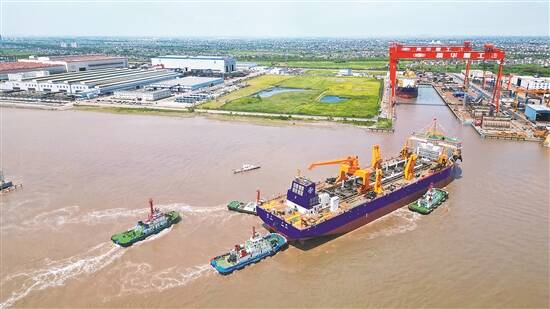 羊城晚报讯 记者王丹阳摄影报道:一个船坞,两艘疏浚领域“国之重器”同时建造,同日下水。 8月26日,长江入海口,由我国自主设计研发建造的亚洲最大、世界领先的超大型耙吸挖泥船“通浚”轮和“浚广”轮成功下水,成为“造岛神器”新旗舰。 此次下水的“通浚”轮和“浚广”轮设计长度198米,型宽38.5米,型深18米,最大挖深120米,最大舱容达35000立方米,相当于一次装满18个标准游泳池的总容量,泥舱容量亚洲第一。 两船具备“强破土、大挖深、远运距、长吹距”等疏浚性能,更加智慧高效全能环保。即使在八级风浪条件下作业,船舶耙头也可伸至约40层楼深度的海底吸挖泥沙,能在90分钟内将泥舱全部填满,装载效率世界领先,堪称疏浚领域的“航母”。 除了容量大,两船都配备甲醇预留双燃料发动机,动力效率与同类船舶相比提升30%。这也意味着,凭借绿色智造,两艘疏浚利器具备全球无限航区航行能力。两船未来可广泛适用于港航疏浚、深远海取砂、吹填造陆、深海采矿、管沟开挖回填、碎石基床及深海管道铺设等施工作业场景。 “国轮国造”和“国货国用”是两船建造的关键词。从概念设计到智能系统开发,从中船708所的船舶设计到上海振华重工的建造,两船建造实现全链条国产化。 同时,两船采用北斗+5G技术,搭配自主研发的“一键疏浚”和“浚驾合一”智能疏浚控制系统,由1名船员操作便可完成所有航行和施工任务,真正实现了疏浚作业的全自动控制。两船建造期间,创新采用“数字化船坞+模块化建造”模式,建造效率提升约20%。 记者了解到,“浚广”轮是土生土长的广东籍“国之重器”,在2024年就被纳入海洋工程设备的广东省首台套目录,目前已获得国家发明专利技术24项。 “浚广”轮此次下水相当于“毛坯房”建成,后续还要进行疏浚机具、智控系统安装等“精装修”,计划今年年底进行海试并在广州港交付使用。届时,这一“造岛神器”新旗舰将成为广东发展海洋产业的高端装备,为打造海上新广东贡献独特力量。 “‘浚广’轮是我们近20年来坚持自主创新的重大成果。”中国交建疏浚事业部执行总经理,中交广航局党委书记、董事长姜松表示,“浚广”轮的建成,意味着中国疏浚产业走向全球第一梯队。