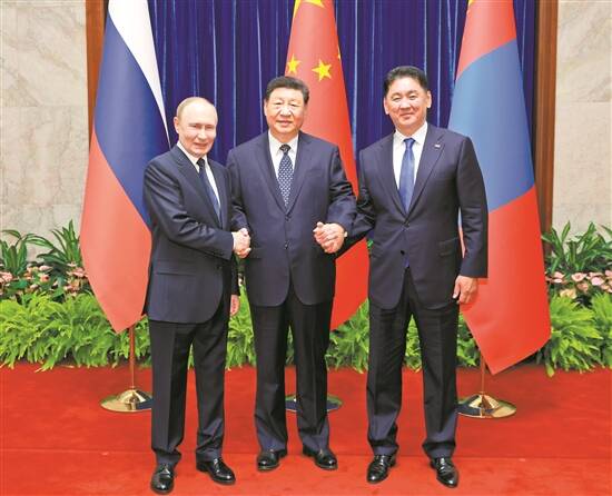 9月2日上午,国家主席习近平同俄罗斯总统普京、蒙古国总统呼日勒苏赫在北京人民大会堂举行中俄蒙三国元首第七次会晤 新华社发 |