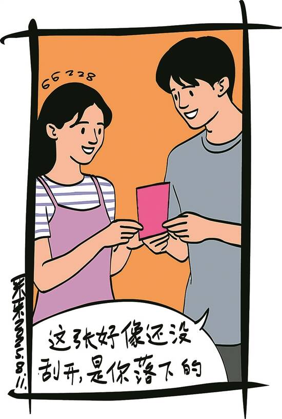插图:采采 这天,李明心情郁闷地在街上溜达,不知不觉已近黄昏。路过一家彩票站时,他停下了脚步,虽然平时很少买彩票,但也想着买一张碰碰运气。 店里人不多,柜台前有个姑娘正低头刮彩票,刮了几张,看样子都没中。这时,姑娘的手机响了,她一边接电话,一边抓起那些刮过的彩票,随手塞进门口的垃圾桶,匆匆走出了店门。 李明买完彩票走到门口,瞥见垃圾桶最上面放着一张崭新的彩票,根本没刮开。他立刻反应过来,肯定是刚才那姑娘落下的。捡起彩票,他犹豫了一下,还是追了出去。 “姑娘!等等!”他小跑几步喊道。姑娘停下脚步,疑惑地回头:“你在叫我吗?”李明扬了扬手里的彩票:“你刚才在彩票站刮奖吧?这张好像还没刮开,是你落下的。” 姑娘愣了愣,接过去一看,恍然道:“哎呀!我买了5张,刮了4张都没中,一接电话就忘了,顺手扔了。太谢谢你了!” “没事。”李明说完就要转身离开。姑娘却叫住了他:“等等!既然是你捡到的,也算是缘分。咱们一起刮吧,中了就平分,没中就当你帮我避免了损失。”李明被她的直爽逗笑了,点头道:“行啊。” 两人在路边的长椅上坐下。姑娘掏出一枚硬币递给李明:“你来刮?”李明接过硬币,小心地刮开覆盖膜。直到刮开最后一条线,“¥500”的字样清晰地露了出来。“中了!”李明惊喜地说。姑娘凑近一看,也笑了:“500元!”两人既意外又开心。 (杨进峰)