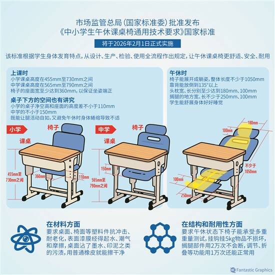 为解决孩子们的午睡问题,近年来,可平躺或倾斜的各式“变形”午休课桌椅在越来越多学校投入使用——上课时,它们是标准的课桌椅;午休铃声一响,它们就能轻松切换形态,让学生舒适“躺睡”。不过,各地选用的午休课桌椅,大小、长短、款式、靠背角度等缺少统一的科学规范。对此,市场监管总局近日批准发布《中小学生午休课桌椅通用技术要求》国家标准,将于明年2月1日正式实施。标准首次从设计、生产到使用全流程,为可折叠午休课桌椅树立了明确规范。 “国标”规定的午休课桌椅,长什么样?据了解,《中小学生午休课桌椅通用技术要求》充分考虑了学生午休的舒适度。比如,展开后的总长度要超过1米,保证学生能伸展开身体;靠背可以放倒到135度以上,接近半躺的舒适角度;甚至连头枕和搁腿的位置都有明确的尺寸要求,确保孩子们能真正睡个好觉。 中国教育科学研究院研究员储朝晖表示,“国标”的推广,并非等于未来所有课桌椅都将变成午休课桌椅,各地可根据实际情况决定是否采用这一新式课桌椅。“国标”的制定,为学生的健康午休画下了基准线。但如何将这条线稳稳地铺进全国众多中小学教室,还需要各地用因地制宜的智慧和实实在在的行动来作答。 (据中央广播电视总台中国之声)