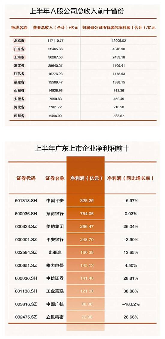 文/图 羊城晚报记者 莫谨榕 实习生 贾瀚阳 作为经济发展的晴雨表,上市公司经营动态始终牵动着市场神经。近日,中国上市公司协会发布的《中国上市公司2025年半年度经营业绩报告》(以下简称《报告》)显示,今年上半年,全市场上市公司实现营业收入35.01万亿元,同比增长0.16%;实现净利润3.00万亿元,同比增长2.54%,增速较上年全年提升4.76个百分点。全市场近六成公司营收正增长,超四分之三公司实现盈利。其中,羊城晚报记者统计发现,广东上市公司合计实现营业收入5.25万亿元,较上年同期增长6.05%,规模仅次于北京,位居31个省份第二位,增长率也位居全国第三;归属母公司股东净利润合计4046.90亿元,同比增长4.49%,也高于A股整体水平。广东上市公司保持稳中有进、稳中向好的发展态势,得益于持续高强度的研发投入,上市公司发展新动能正在不断累积。 近六成公司营收正增长 超四分之三公司盈利 从半年报数据可见,我国上市公司产业布局、产品结构、市场拓展持续优化,消费、工业制造领域转型升级不断推进,业绩逐步回暖。《报告》显示,今年上半年,全市场上市公司实现营业收入35.01万亿元,同比增长0.16%。第二季度营收18.11万亿元,同比增长0.43%,环比增长7.15%。上半年实现净利润3万亿元,同比增长2.54%,增速较上年全年提升4.76个百分点。全市场近六成公司营收正增长,超四分之三公司实现盈利,2475家公司净利润正增长,1943家公司营收、净利双增长。 剔除金融行业,实体上市公司实现营收30.42万亿元,与上年同期持平;实现净利润1.59万亿元,同比增长0.94%。创业板、科创板、北交所上市公司上半年营收增幅明显,分别为9.03%、4.90%、6.08%,创业板净利润增速11.18%,远超市场整体水平。民营上市公司表现亮眼,民营控股上市公司盈利水平大幅修复,营收、净利增速分别为4.80%、10.01%,分别比上年同期提升0.97和20个百分点,成为市场稳定发展的重要支撑力量。 分行业看,在19个门类行业中,17个行业实现盈利,7个行业营收正增长,10个行业净利润正增长。农林牧渔业、交通运输、仓储和邮政业等7个行业营收、净利润双增长。10个制造业次类行业全部实现盈利,其中6个行业营收正增长,5个行业净利润正增长,专用、通用及交通运输设备,电气、电子及通讯等4个行业营收、净利润双增长。 A股研发强度再提升 工业制造活力十足 随着促消费政策持续加码,消费市场潜能逐步释放,成为拉动经济增长的关键引擎。在A股上市公司中,新能源汽车产销延续高增长态势,净利增长超30%;家电换“智”趋势显现,行业营收、净利润增长均超9%;消费电子国产替代加速,行业营收增长24.82%。文化消费需求释放,游戏、影视院线等代表性行业营收均实现增长,净利增速超70%。 工业制造业绩回暖。上半年,制造业经营状况边际改善,营收、净利润同比增速为4.73%、7.75%。军工、新能源、医疗器械等先进制造领域原料需求旺盛,叠加供给结构性收紧,有色金属和塑料制品价格持续突破新高,两行业营收增速分别为6.49%、10.10%,净利增速分别为36.55%、19.59%。受益于产业链下游景气周期,尤其是海外客户业务扩张,光模块、PCB行业订单量保持高位,光模块上市公司净利润翻倍、PCB上市公司净利润增长近50%。 从研发投入看,上市公司持续加码创新投入,通过技术攻关、数智化转型等路径培育新质生产力,构筑发展新优势。上半年,上市公司全市场研发投入超8100亿元,同比增长3.27%,增速较去年同期提升近2个百分点。整体研发强度2.33%,同比小幅提升。全市场113家公司研发投入超10亿元,926家公司研发强度超10%。创业板、科创板、北交所研发强度分别为4.89%、11.78%、4.63%,科技属性进一步凸显。 粤企营收居全国第二 增速规模双双领跑 作为经济大省,广东上市公司在上半年业绩表现同样亮眼。广东902家上市公司已披露半年度业绩,合计实现营业收入5.25万亿元,较上年同期增长6.05%,不仅规模仅次于北京,位居31个省份第二位,增长率也位居全国第三;归属母公司股东净利润合计4046.90亿元,较上年同期增长4.49%。 盈利面同样可圈可点。上半年,约74.83%的广东上市公司(共675家)实现盈利,其中463家企业净利润实现同比增长,占比超半数(达54.10%),较去年同期又再度提升,广东上市公司整体盈利能力稳步增强。 营收规模方面,广东上市公司“千亿军团”继续扩容,上半年9家企业营收突破千亿元,中国平安成功突破5000亿元大关居首,比亚迪以3712.81亿元紧随其后,增长率高达23.29%,工业富联也达到3607.60亿元,同比增长35.58%,美的集团以2523.31亿元、招商银行以1699.69亿元紧随其后。顺丰控股、立讯精密、保利发展、万科A等企业营收亦超千亿元,共同构成广东上市公司营收“第一梯队”。 在净利润榜单中,中国平安以825.25亿元领跑,招商银行以754.05亿元紧随其后,美的集团、平安银行、比亚迪、格力电器、中信证券、工业富联等企业都超过百亿元净利润。其中,中国平安净利润同比微降6.97%,美的集团则同比增长26.04%,中信证券、工业富联净利润增幅也分别达到28.81%和38.86%。值得一提的是,特一药业、奥拓电子、拾比佰等8家企业扣非净利润增幅超10倍,展现出强劲的成长韧性。 A股公司每5元研发费用有约1元来自广东 研读2025广东上市公司半年报,可以看到“稳中有进”的态势持续发展,“新的动能”不断积累。 广东上市公司业绩的亮眼表现,离不开高强度