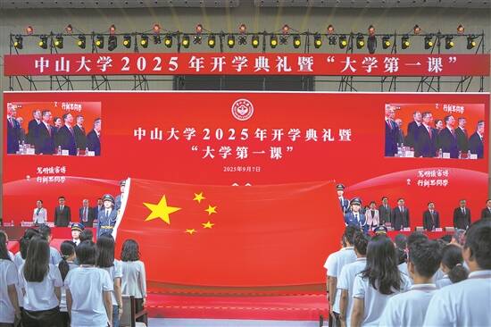 羊城晚报讯 记者陈亮报道:9月7日,中山大学2025年开学典礼暨“大学第一课”在广州校区南校园举行。2万余名本科新生和研究生新生,线下线上齐聚一堂,共上大学第一课。《坪石先生》校史故事的动情展示,五星红旗的庄严入场,向高中母校献花的致敬感恩,让这堂大学第一课精彩纷呈、意义深远。 今年是中国人民抗日战争暨世界反法西斯战争胜利80周年,这堂大学第一课也是新生们的红色第一课。 中山大学的抗战历史对于中大人是一段刻骨铭心的血色记忆。当广州深陷战火,学校一度迁校办学。1940年,心系家国命运的中大人多次发起迁校请愿,希望能回到抗战前线作出贡献。于是,大家踏上了回迁广东之路,来到粤北坪石。以黄际遇、杜定友、卫梓松为代表的中大人,坚持办学,知识救国,在战火中赓续文脉,被后人称为“坪石先生”。 开学典礼上,新生们集体观看了电影《坪石先生》宣传片,对中大在坪石办学的历史有了更深刻的认识和感悟。海洋科学学院2025级本科新生米君颐说,看完《坪石先生》宣传片心里沉甸甸的。“他们舍身保护书籍、坚持办学的画面,让我突然理解了什么叫坚守和传承。今天的我们坐在窗明几净的教室里,更应该认真对待每一堂课、每一页书。”米同学说,将倍加珍惜现在的时光,把知识真正学进心里、报效祖国。 今年是中山大学迈向新百年的第一年。如何做有为中大人?校长高松院士分享了他的建议,一是要心怀“国之大者”,博学报国;二是要兼听而包容,审慎明辨;三是要勇于走在前沿,笃行致远。 “我们是什么样子,中大就是什么样子。”中大党委书记朱孔军对新生提出了三点希望,成为“有理想有追求”的中大人,志存高远,坚定前行;成为“有良知有温度”的中大人,修身立德,仁爱向善;成为“有担当有责任”的中大人,心系家国,勇挑重担。