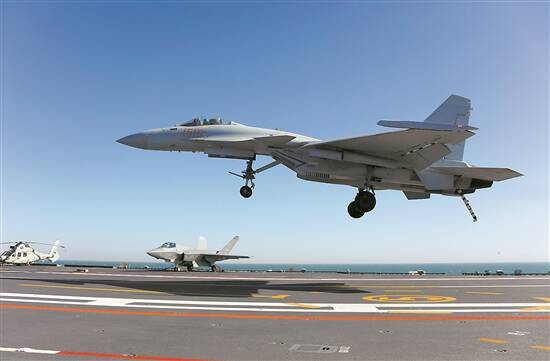 歼-15T舰载战斗机在福建舰阻拦着舰(资料照片) 新华社发 |
