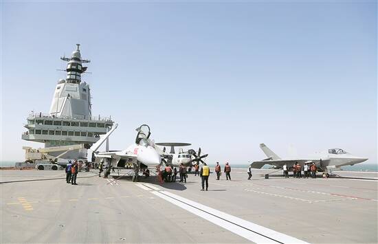 歼-15T、歼-35和空警-600三型舰载机列阵福建舰飞行甲板(资料照片) 新华社发 |