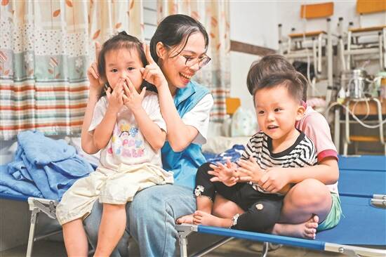 24日,茂名市博贺镇博美小学安置点内,社工郑嘉丽与孩子们互动 |